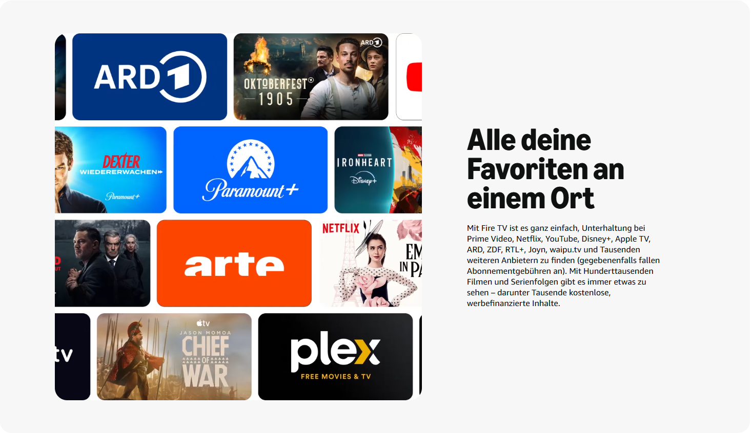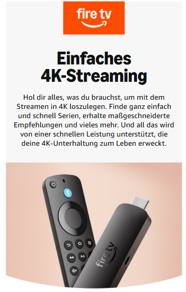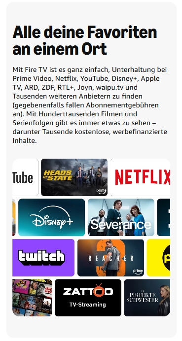 - Alle deine Favoriten an einem Ort – Erlebe endlose Unterhaltung mit Zugriff auf Prime Video, Netflix, YouTube, Disney+, Apple TV, ARD, ZDF, RTL+, Joyn, waipu.tv und Tausende weitere Anbieter. Suche aus Hunderttausenden von Filmen und Serienfolgen ganz einfach heraus, was du sehen möchtest (es können Abonnementgebühren anfallen), darunter Tausende Folgen kostenloser, werbefinanzierter Inhalte.