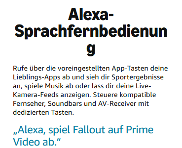 - Alexa immer griffbereit: Drücke und bitte Alexa, in verschiedenen Apps Serienfolgen zu suchen und zu starten.