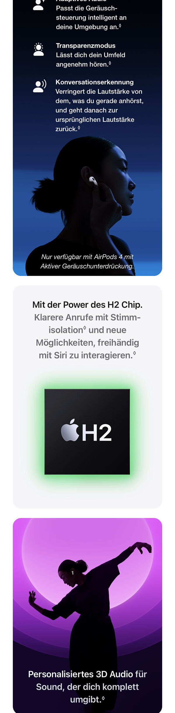 • BESSERE WIEDERGABE- UND GESPRÄCHSQUALITÄT – Die AirPods 4 kommen mit dem von Apple designten H2 Chip. Stimmisolation verbessert die Qualität von Anrufen in lauten Umgebungen. Mit fortschrittlichem computergestützten Audio reduziert sie Hintergrundgeräusche und isoliert gleichzeitig den Klang deiner Stimme am Telefon.