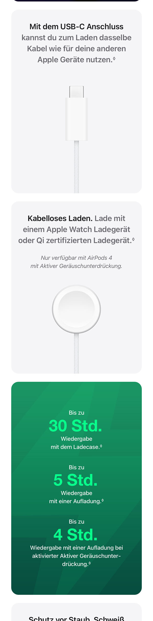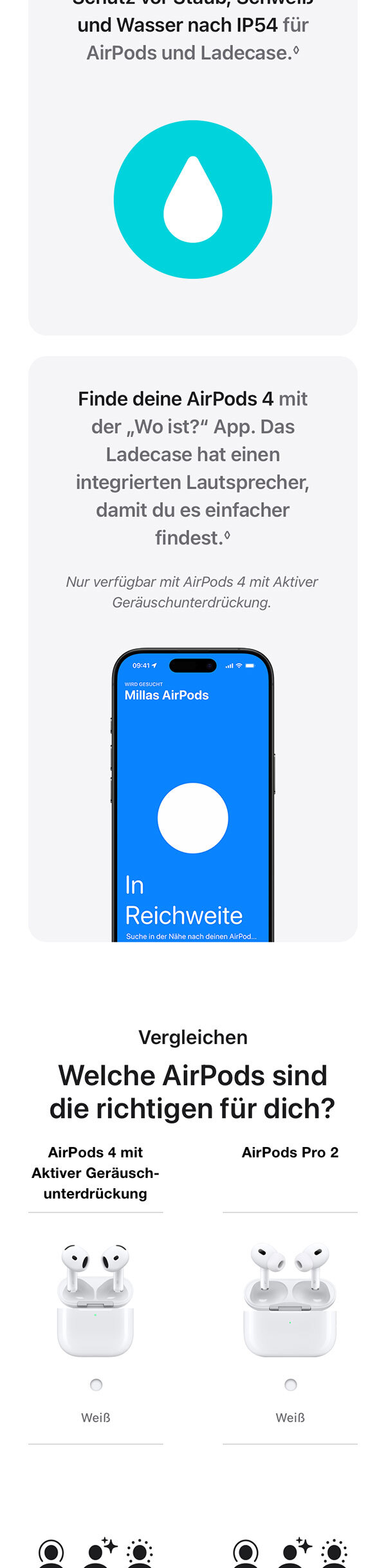 • SCHUTZ VOR STAUB, SCHWEISS UND WASSER – AirPods 4 und das Ladecase bieten Schutz vor Staub, Schweiß und Wasser nach IP54. Du kannst sie also auch bei Regen und anstrengenden Workouts tragen.