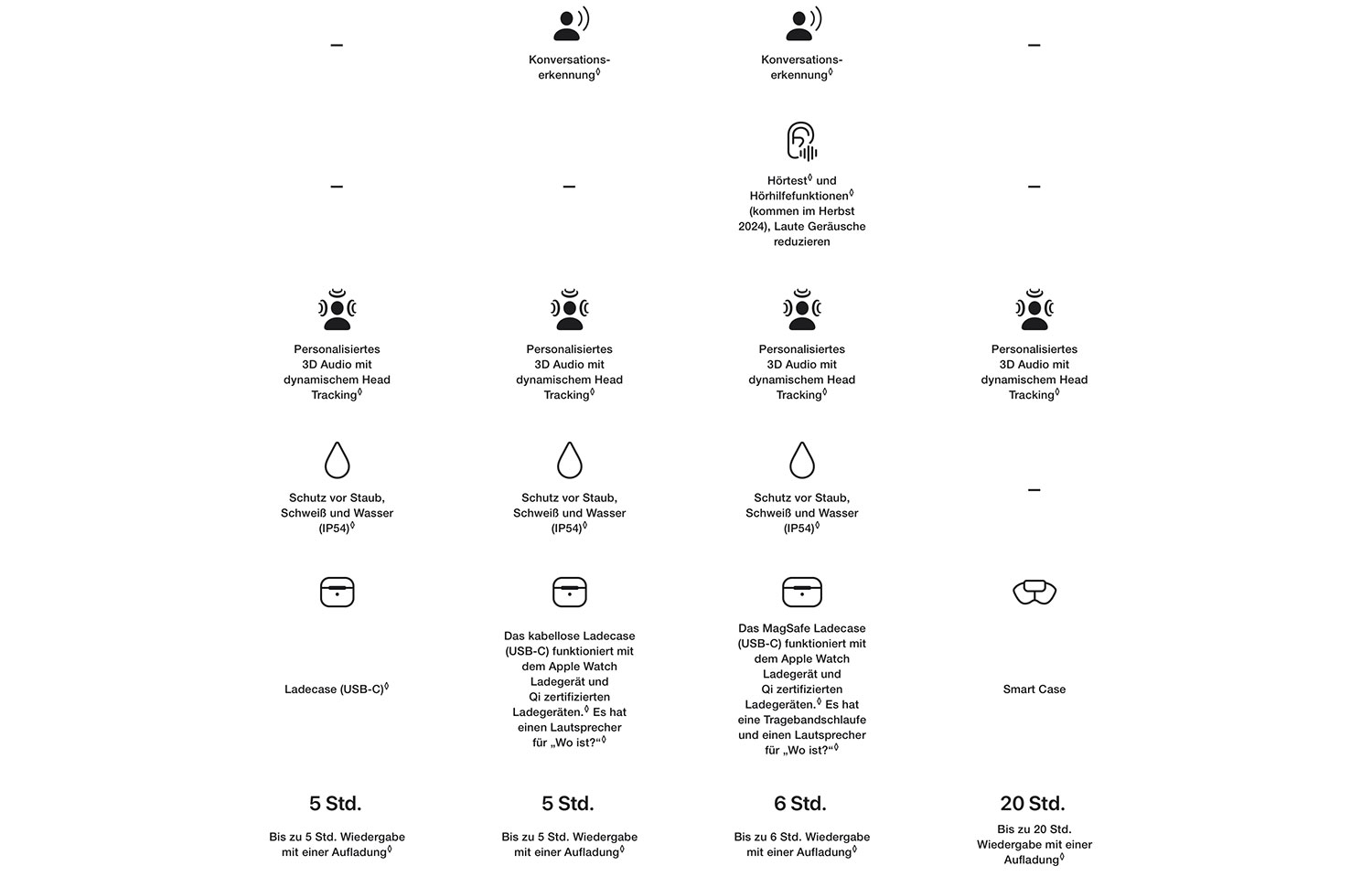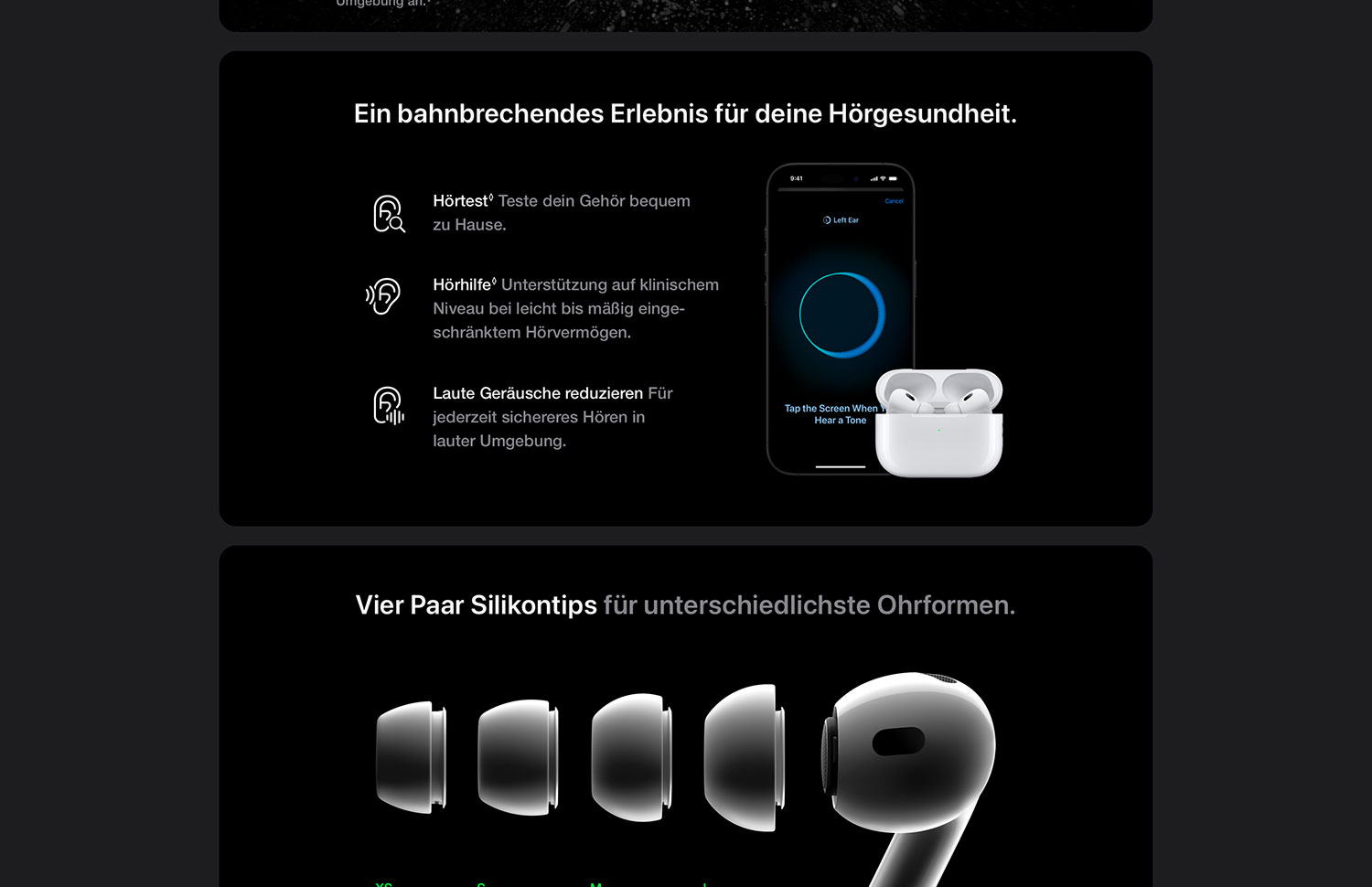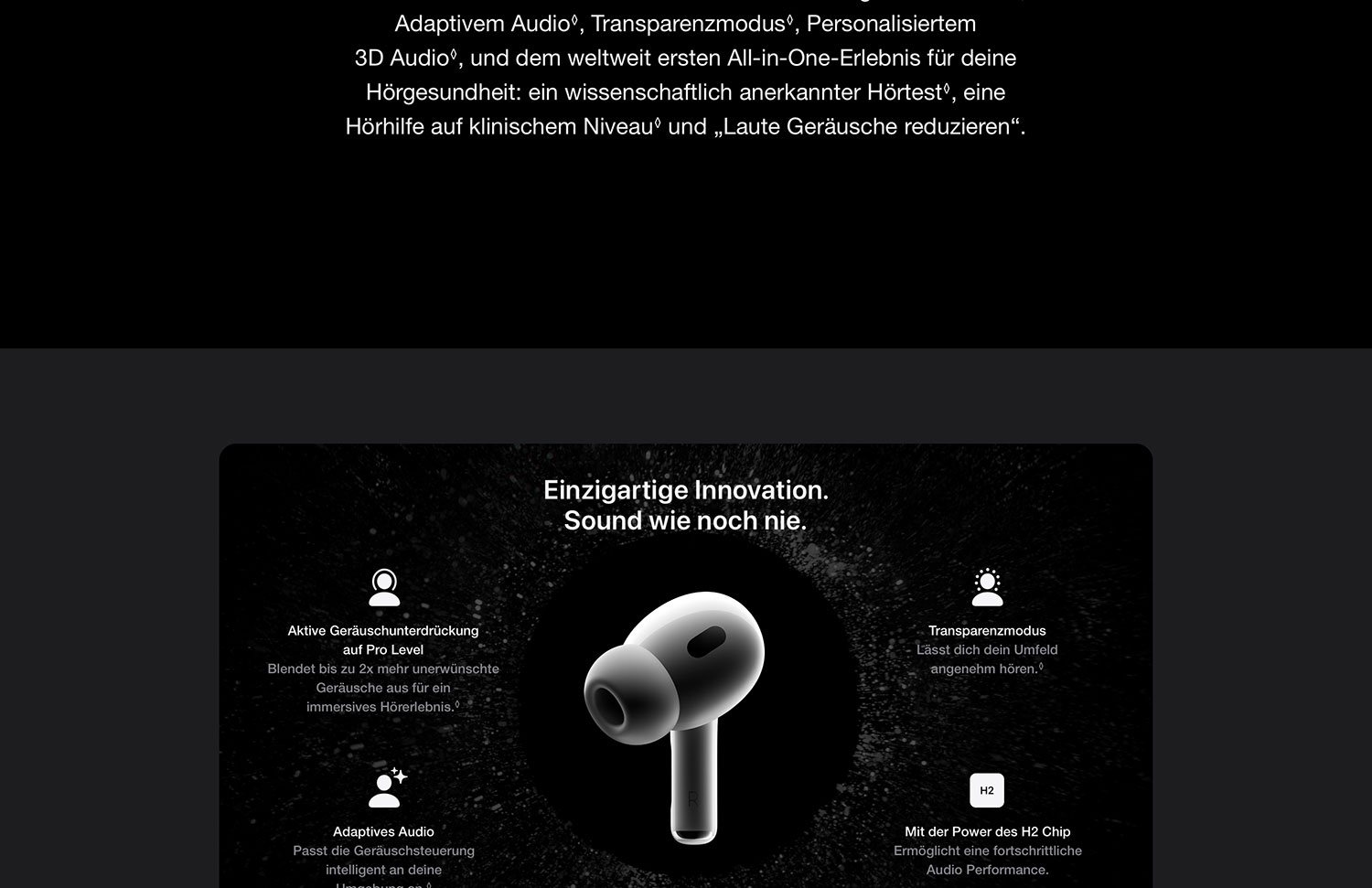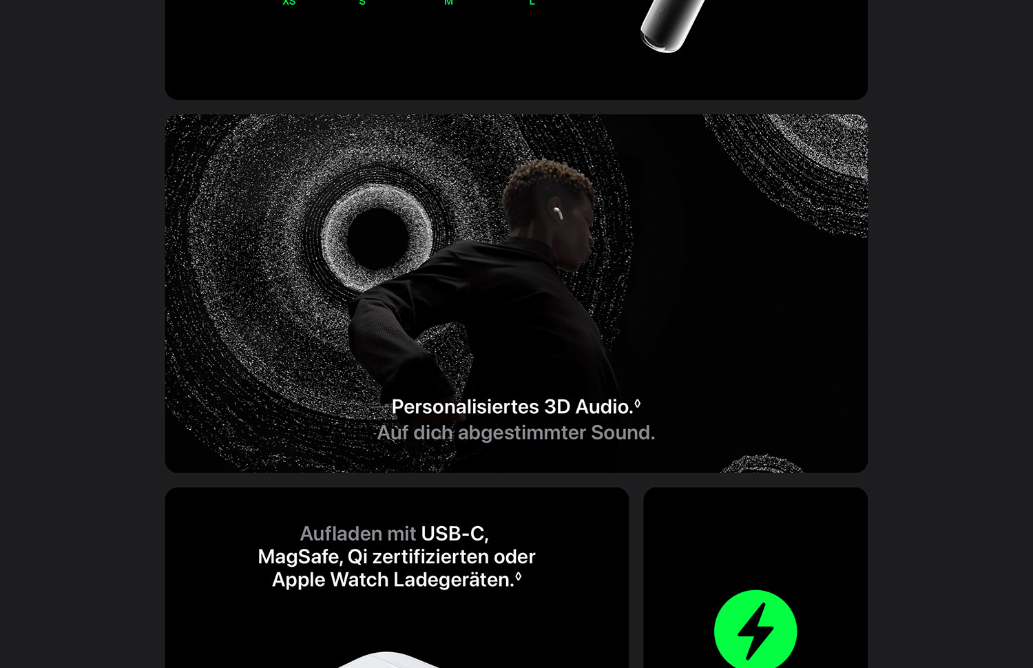 - Personalisiertes Spatial Audio umgibt Sie mit einem speziell auf Sie abgestimmten Klang. Es arbeitet mit dynamischem Head-Tracking, um Sie tiefer in Musik und Filme einzutauchen.