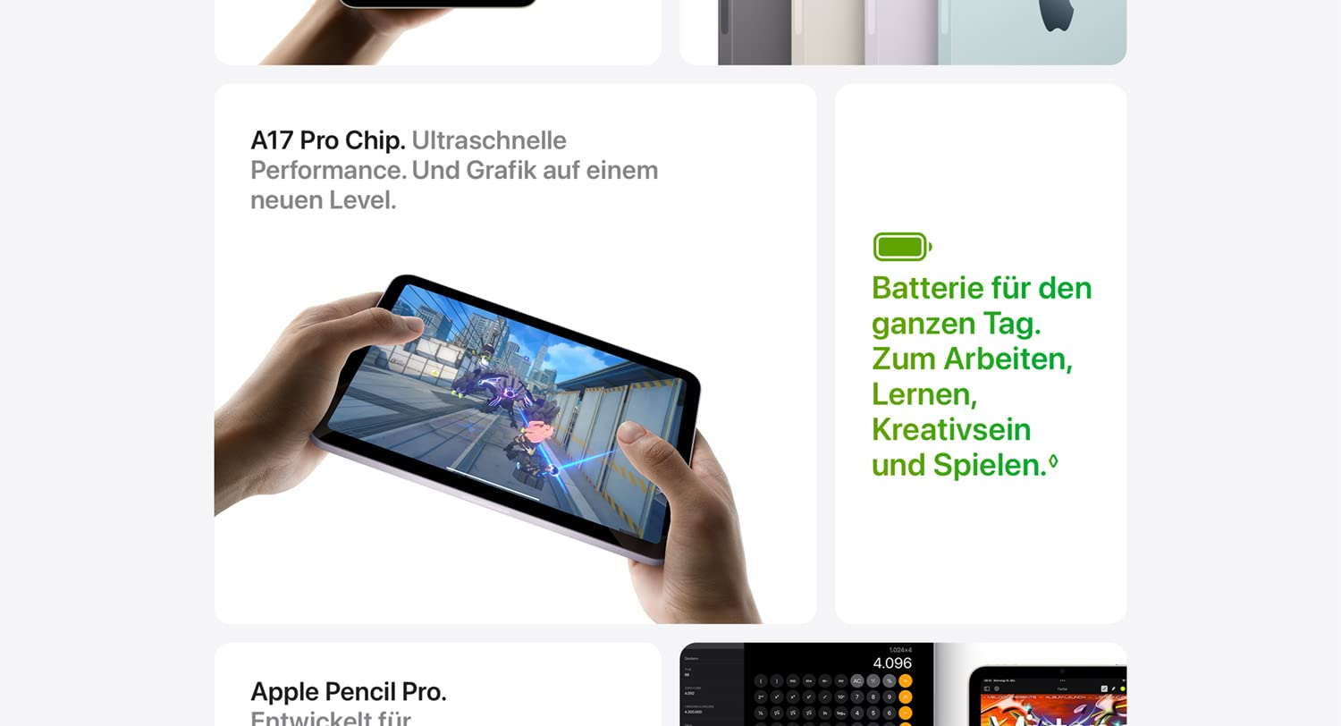 • PERFORMANCE UND SPEICHERPLATZ – Der A17 Pro Chip liefert eine leistungsstarke Performance und eine ultraschnelle Grafik. Und mit der Batterie für den ganzen Tag ist das iPad mini immer bereit für alle Aufgaben oder Projekte.* Mit Speichervarianten ab 128 GB für alle Apps, Musik, Filme und mehr.*