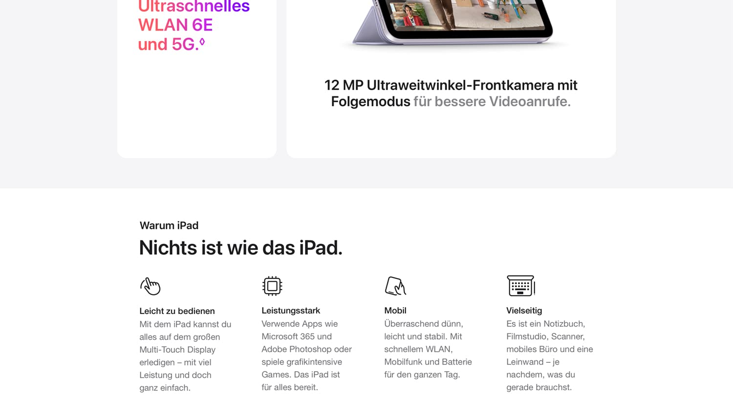 • WARUM IPAD MINI – Das komplette iPad Erlebnis im ultramobilen Design. Mit einem 8,3" Liquid Retina Display*, ultraschnellem A17 Pro Chip, 12 MP Ultraweitwinkel-Frontkamera mit Folgemodus, USB C Konnektivität, superschnellem WLAN 6E und Kompatibilität mit dem Apple Pencil Pro.* Mach Notizen, kommentiere Dokumente und bearbeite Fotos und Videos.