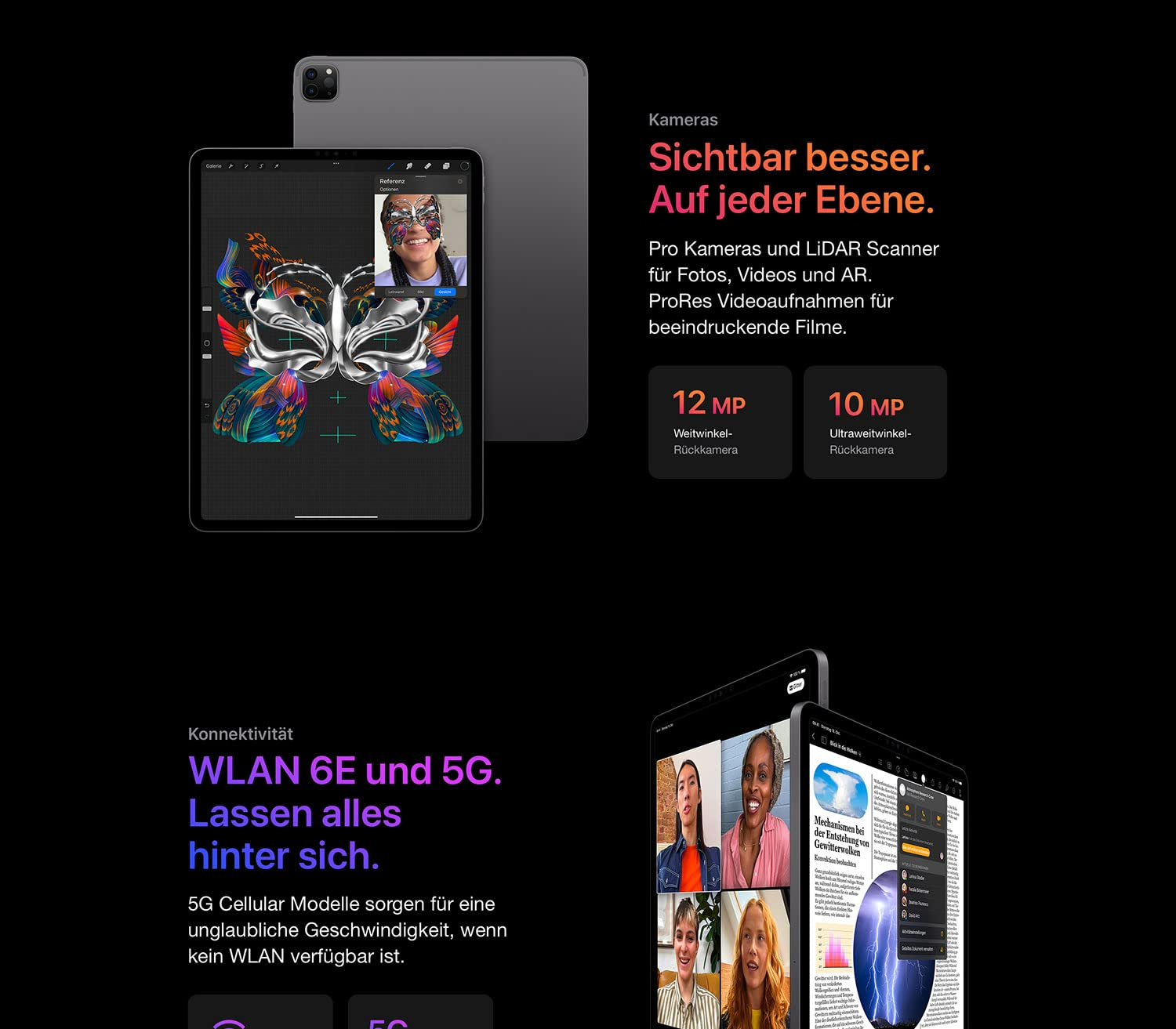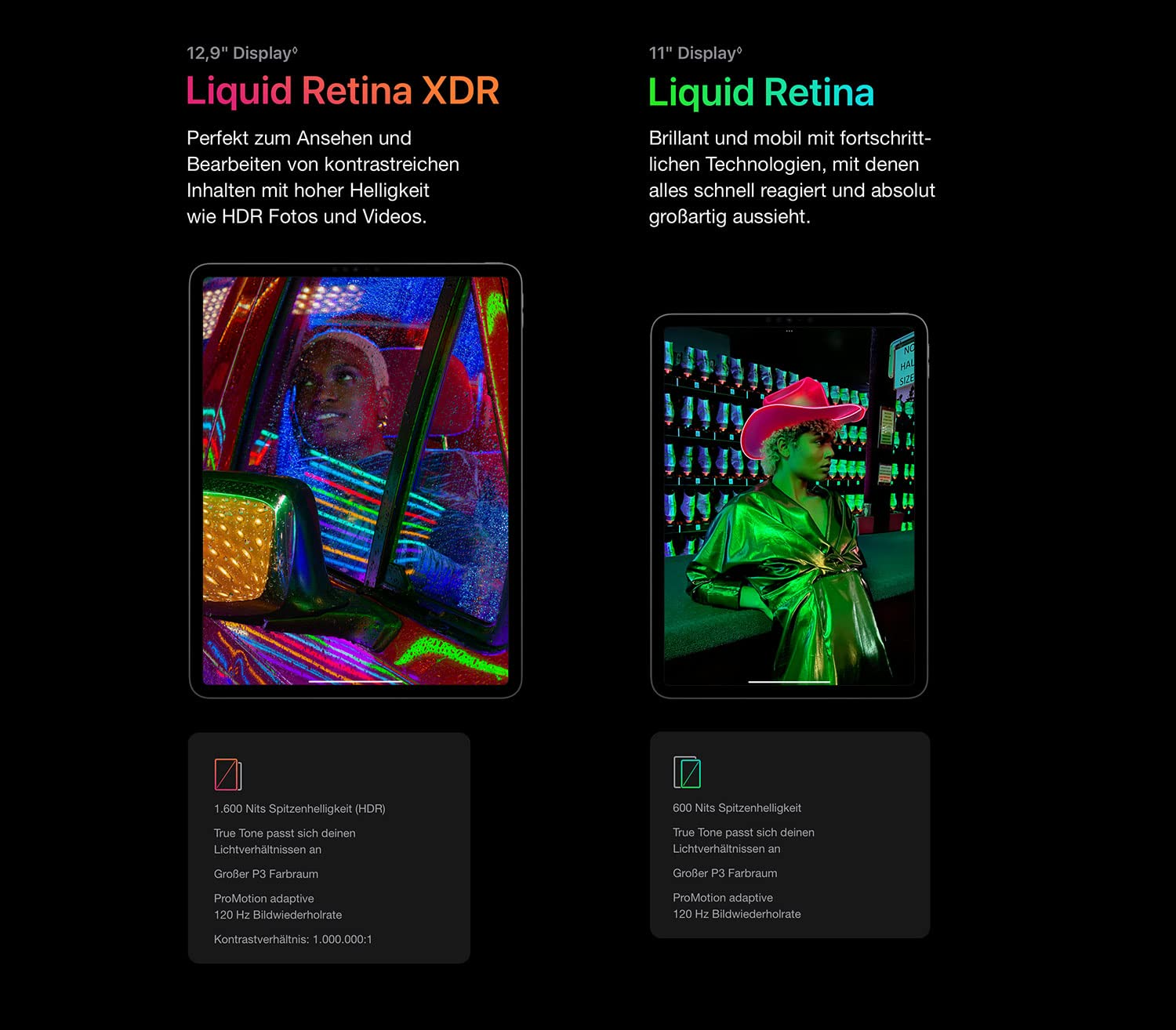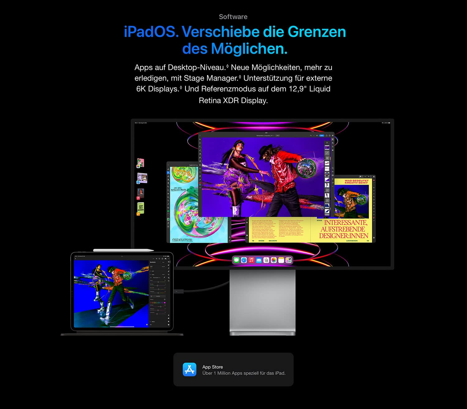 • Brillantes 12,9" Liquid Retina XDR Display mit ProMotion, True Tone und großem P3 Farbraum