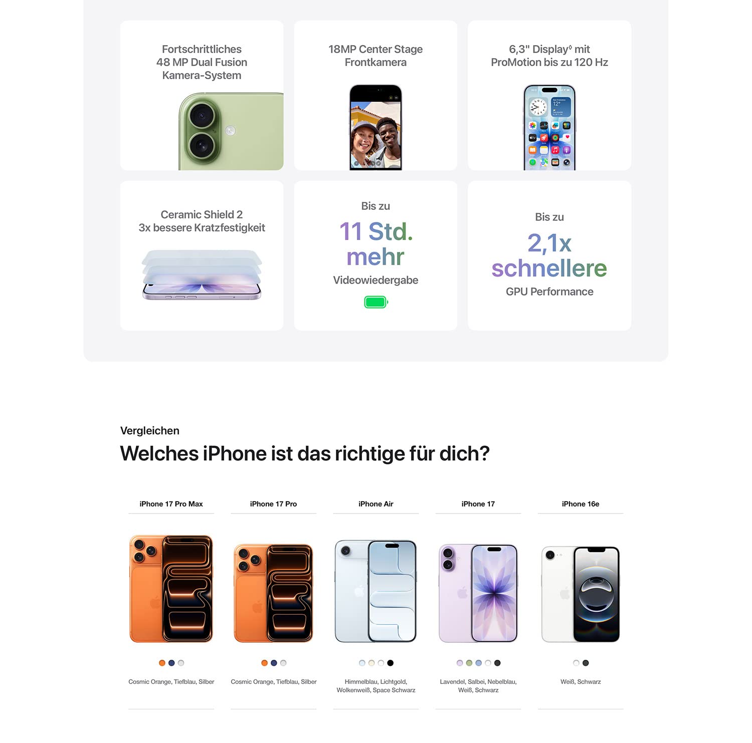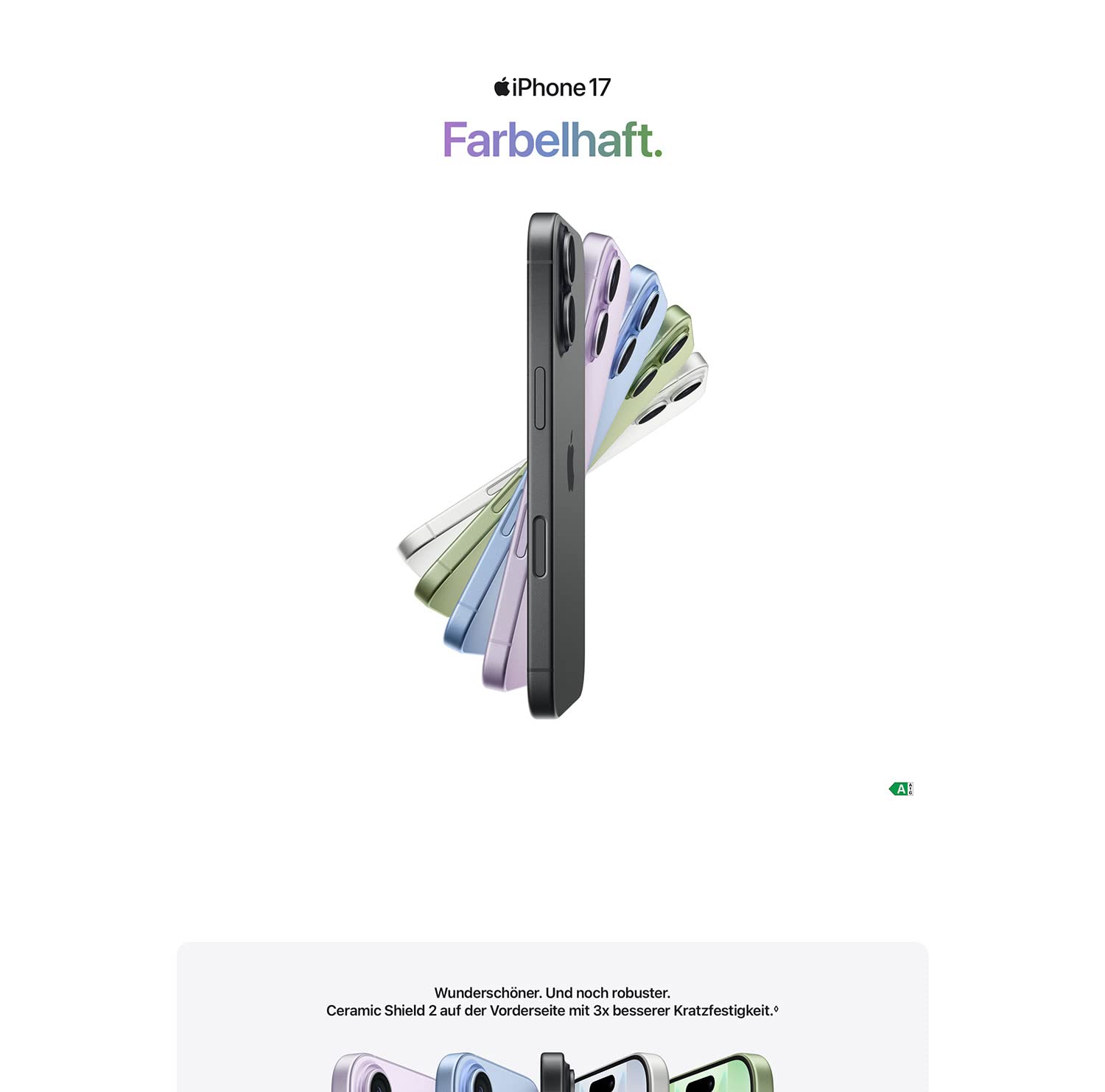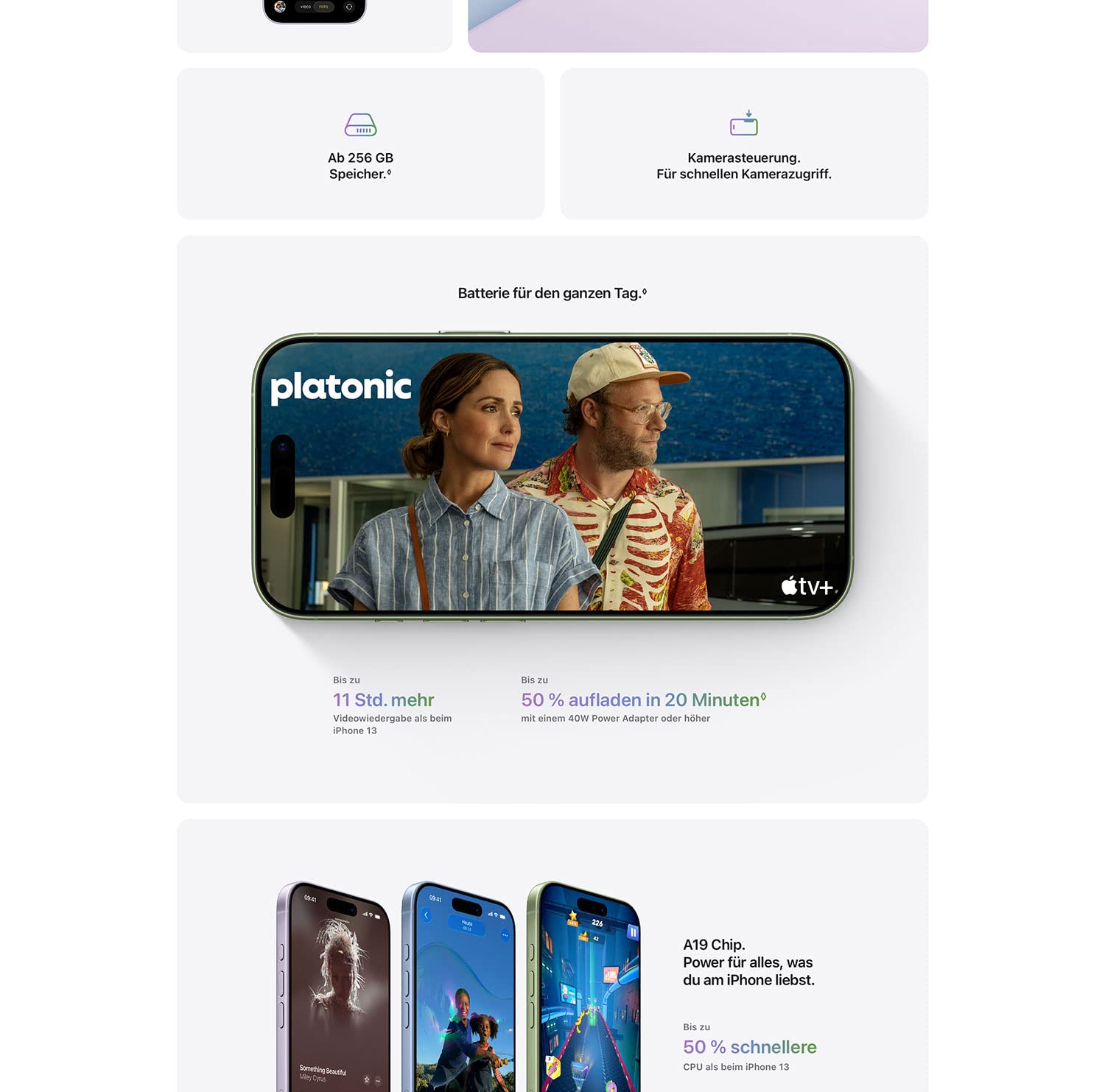 • A19 CHIP. VIEL LEISTUNG. VIEL LÄNGER. − Mit einer 5 Core GPU unterstützt die verbesserte Neural Engine alles, was du auf dem iPhone machst – von Apple Intelligence bis AAA Games.