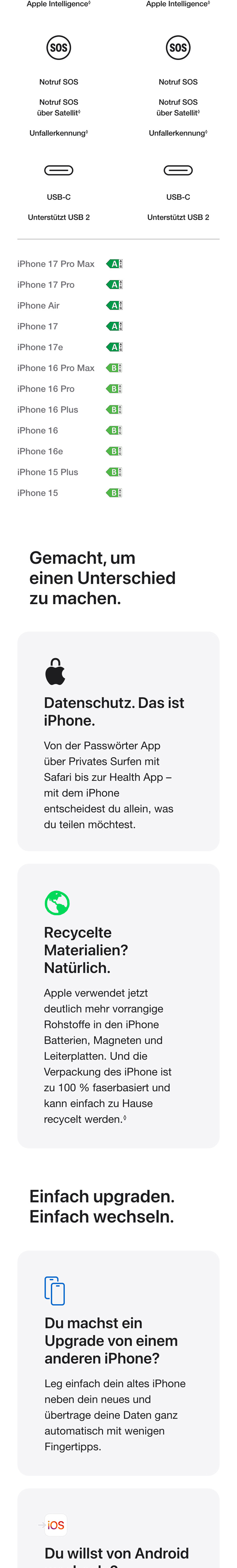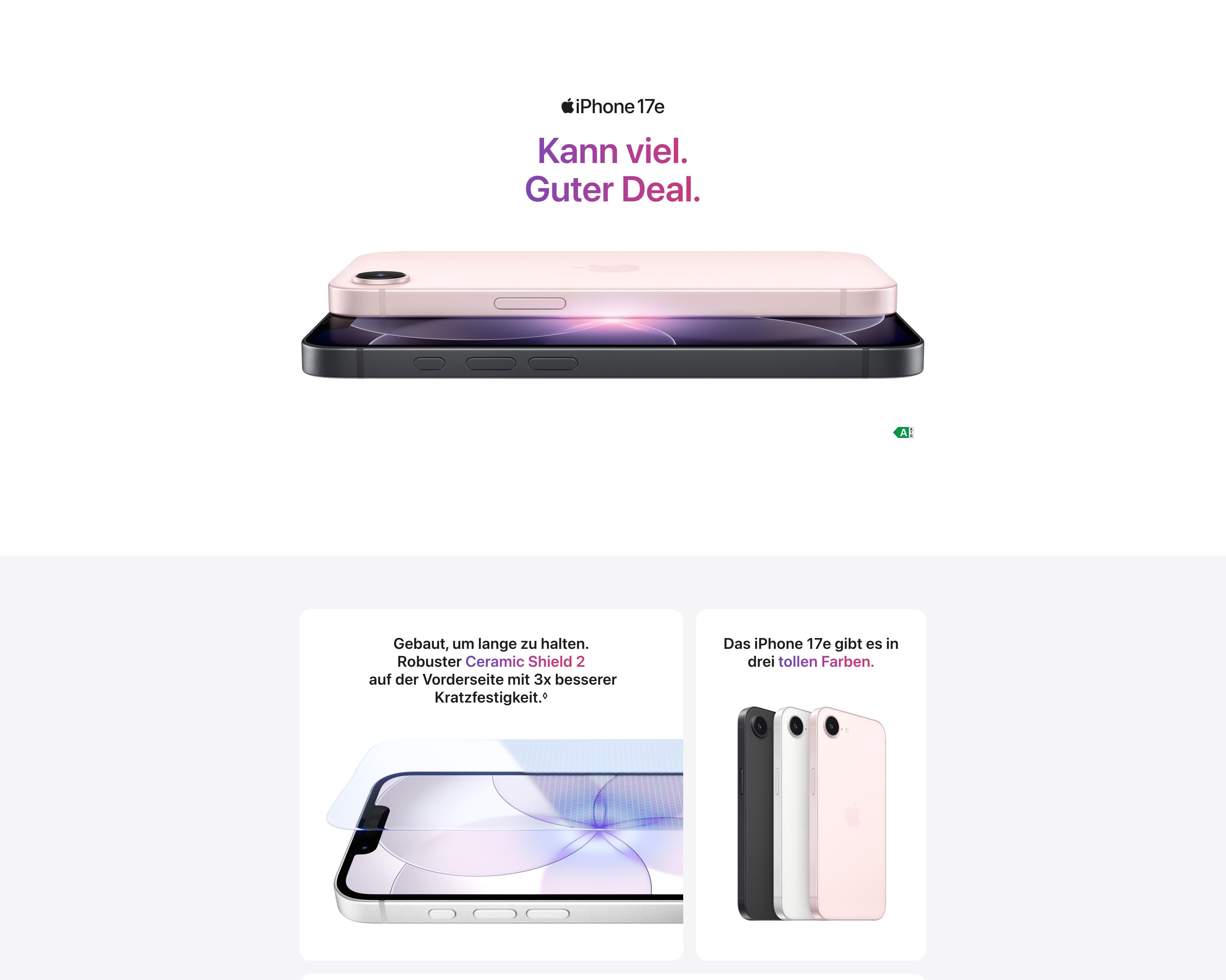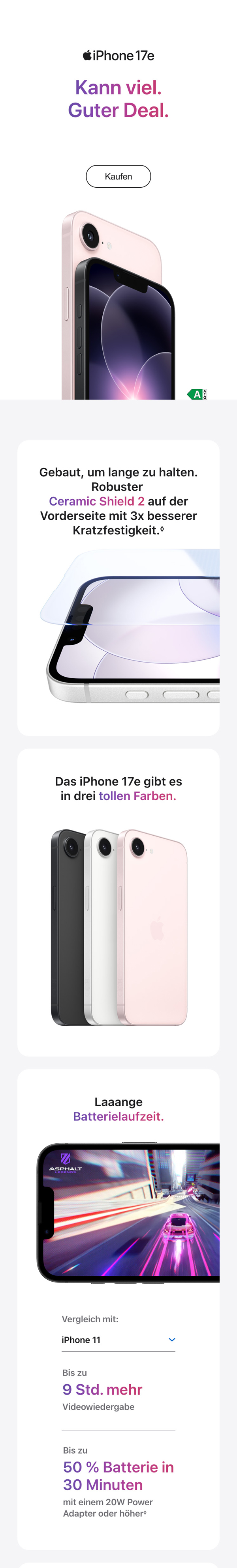 - BEGEISTERT SCHON BEIM BEZAHLEN – Das iPhone 17e kommt mit vielen großartigen Features, die auch das iPhone 17 hat. Und das zu einem richtig guten Preis.