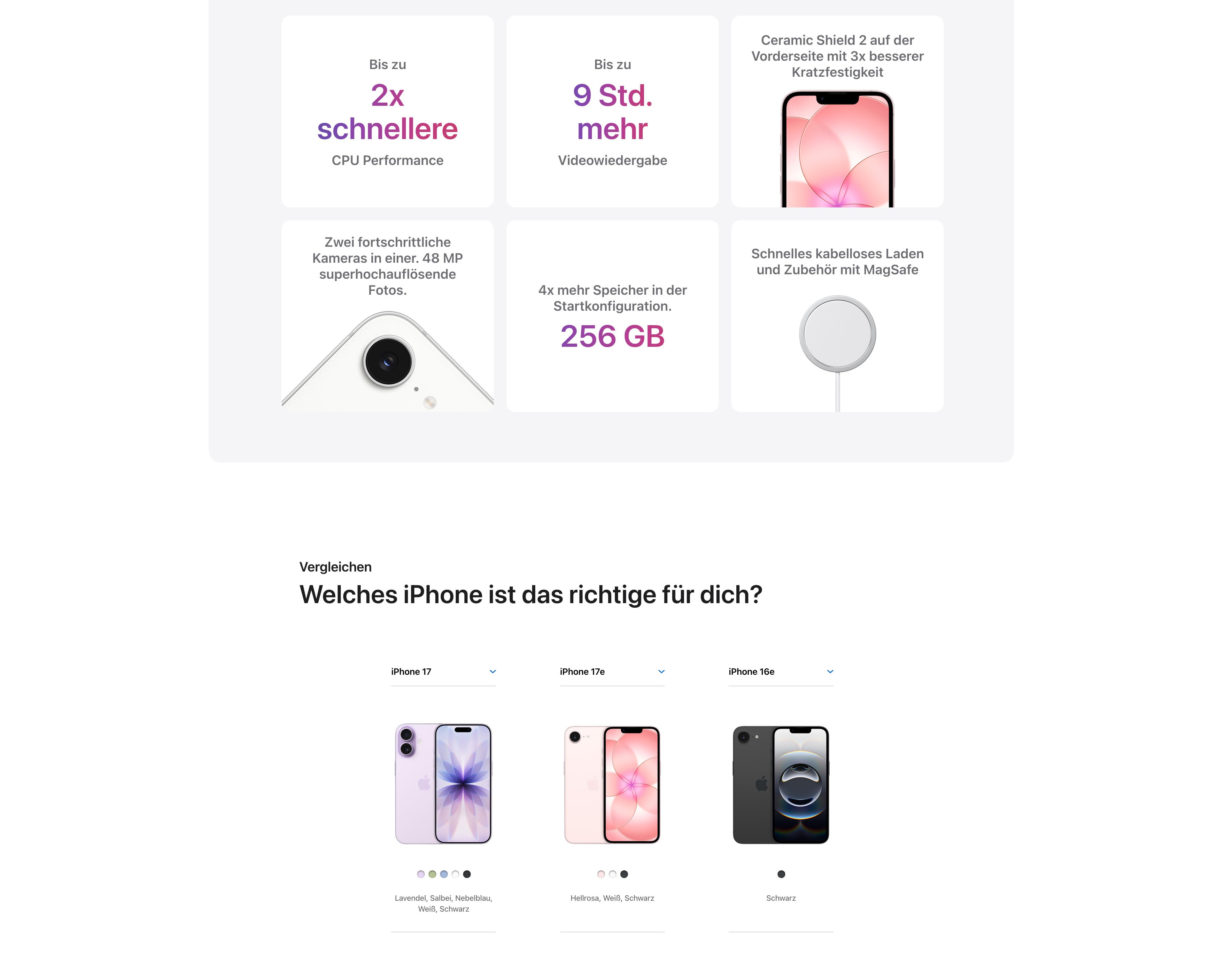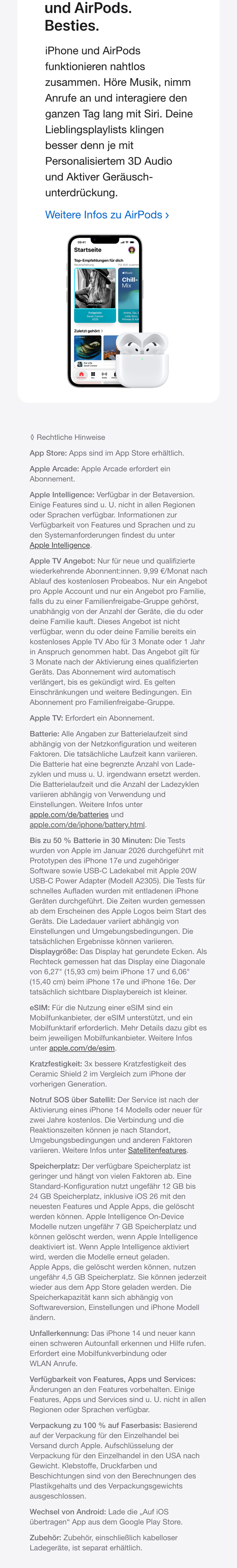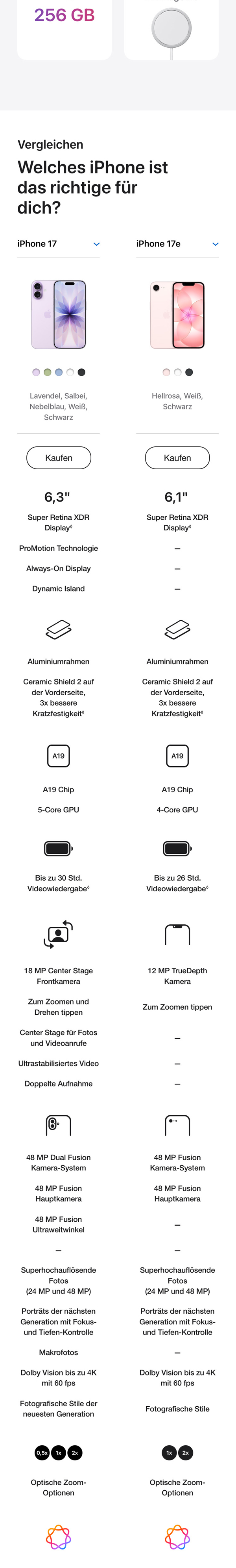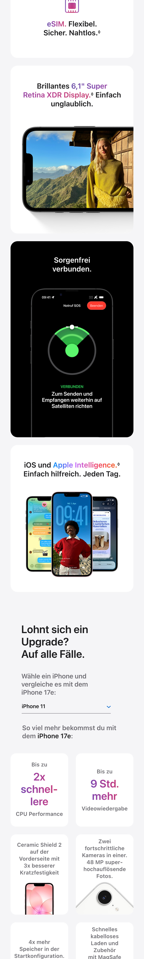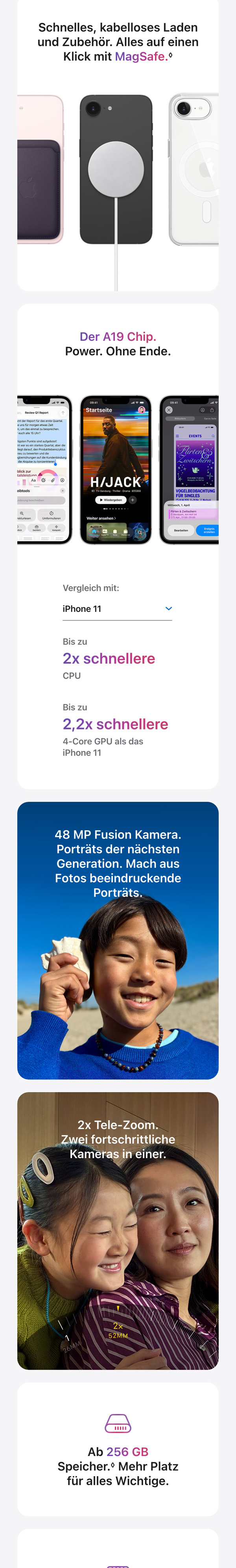 - SCHNELLES KABELLOSES LADEN. ALLES AUF EINEN KLICK MIT MAGSAFE – Das iPhone 17e ermöglicht kabelloses Laden mit bis zu 15 W, im Vergleich zu 7,5 W beim iPhone 16e. Du kannst es also jederzeit einfach, bequem und schnell laden.