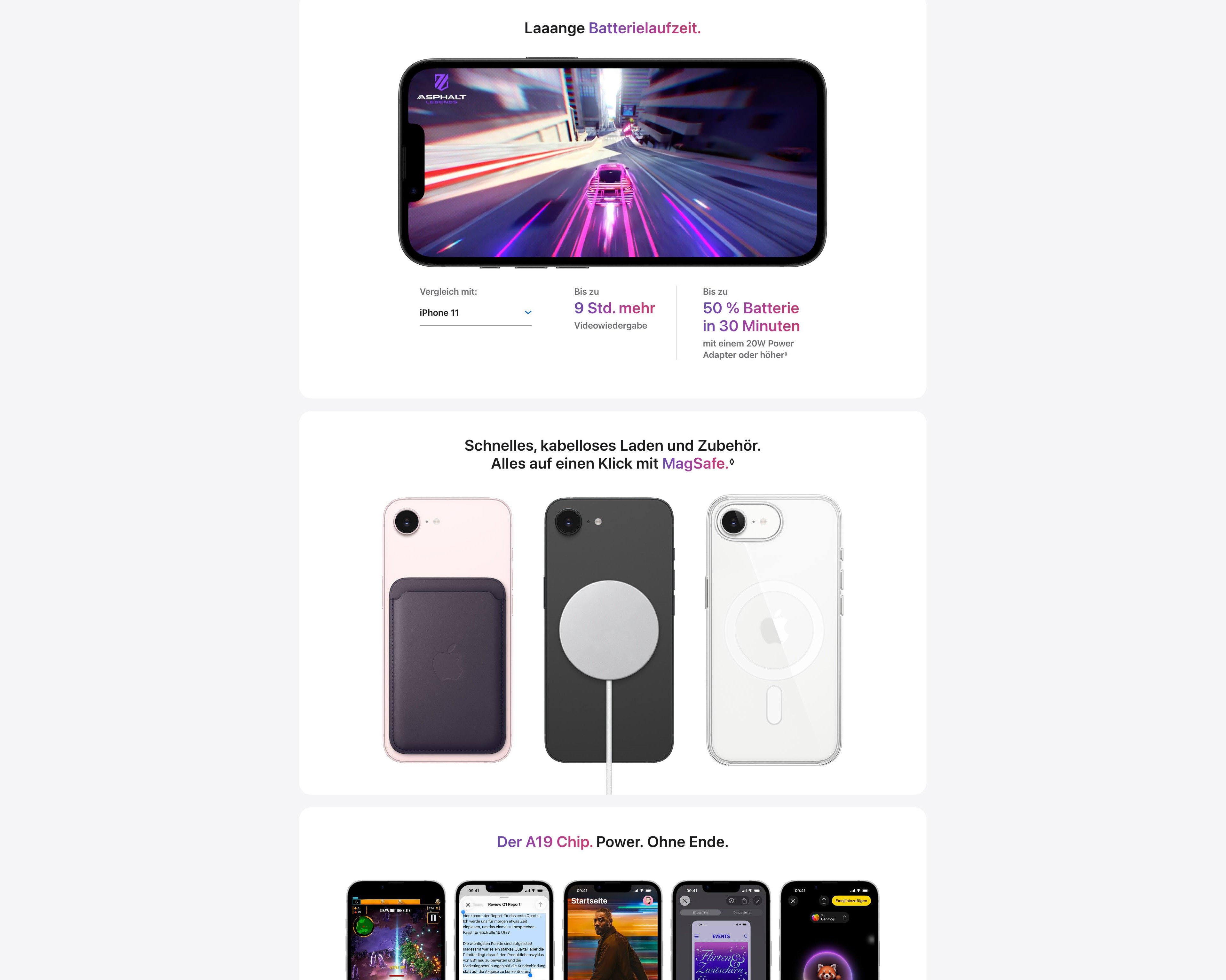 - A19 CHIP. POWER. OHNE ENDE. – Mit dem A19 Chip fühlt sich alles, was du machst, schnell und flüssig an – auch anspruchsvolle AAA Games, 4K Streaming und mehr.