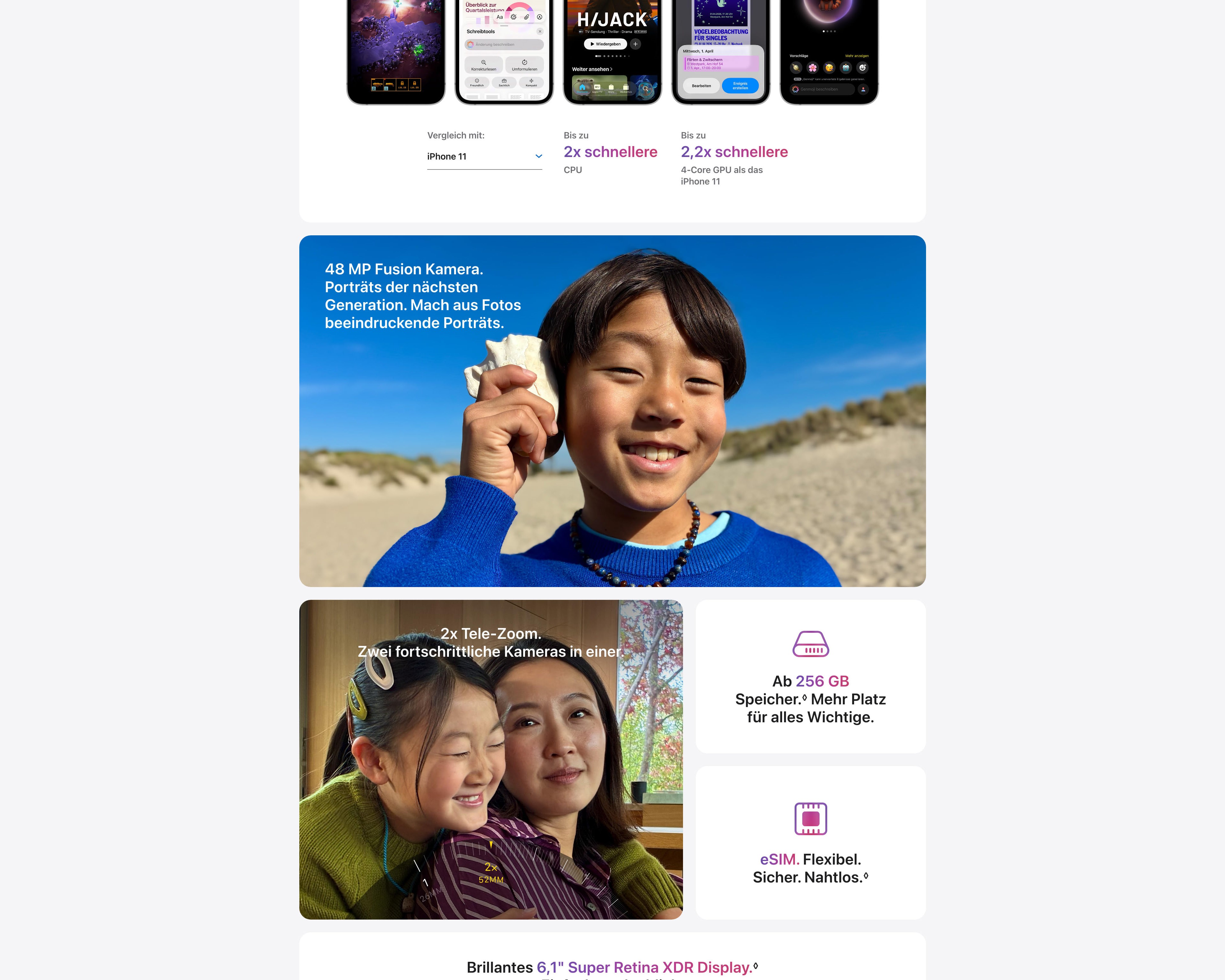 - ROBUSTES DESIGN. BRILLANTES DISPLAY − Beeindruckendes 6,1" Super Retina XDR Display. Ceramic Shield 2 auf der Vorderseite mit 3x besserer Kratzfestigkeit als beim iPhone 16e. Über USB C kannst du Apple Geräte und eine große Auswahl an Zubehör laden und verbinden.