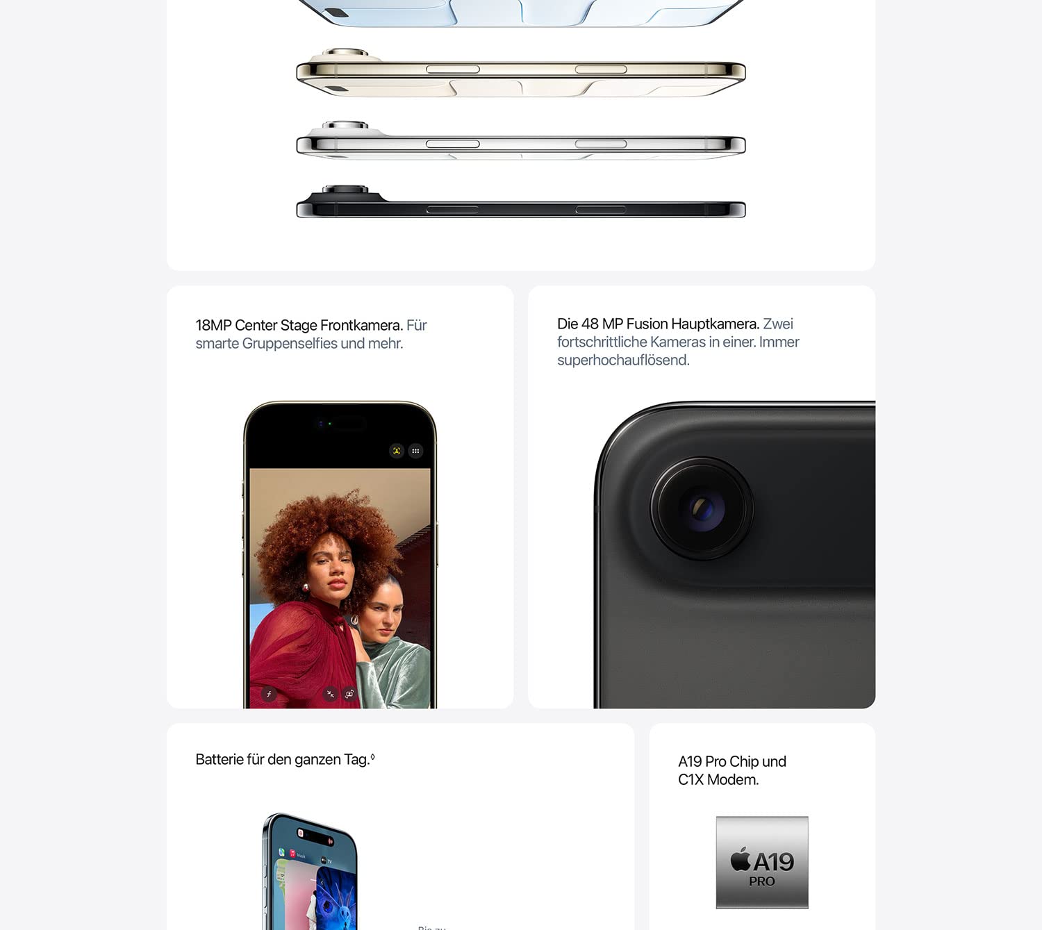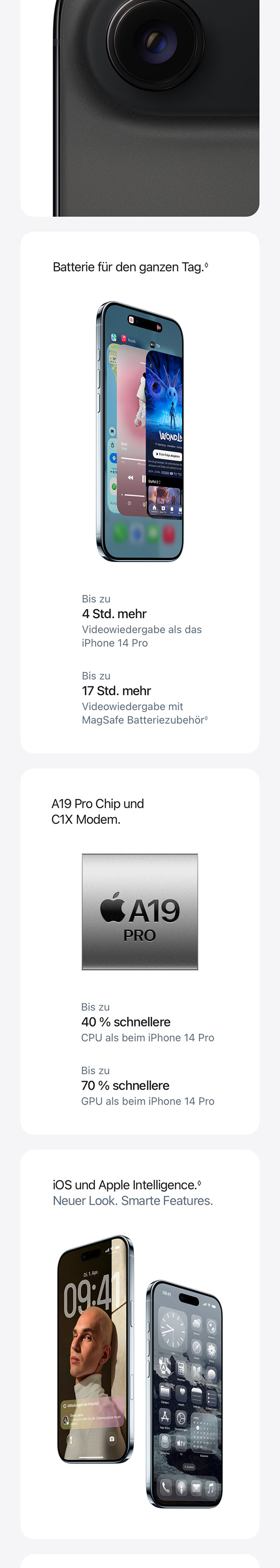 - A19 PRO CHIP. EXTREM SCHNELL. EXTREM EFFIZIENT. − Der A19 Pro ist der effizienteste iPhone Chip, den es je gab. Er liefert Pro Performance und das in einem bahnbrechenden dünnen und leichten Design.