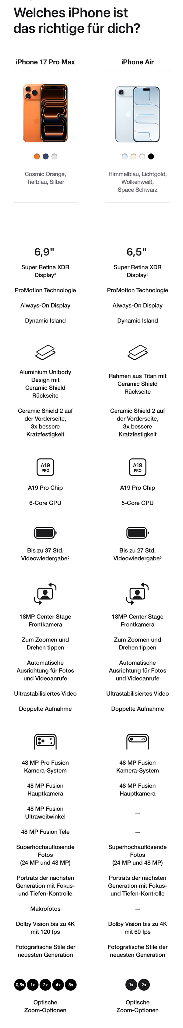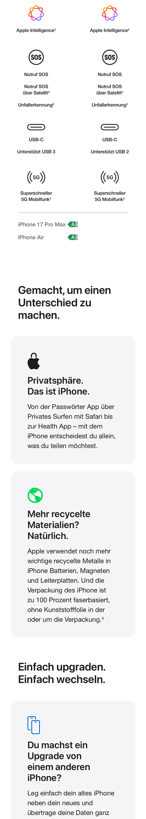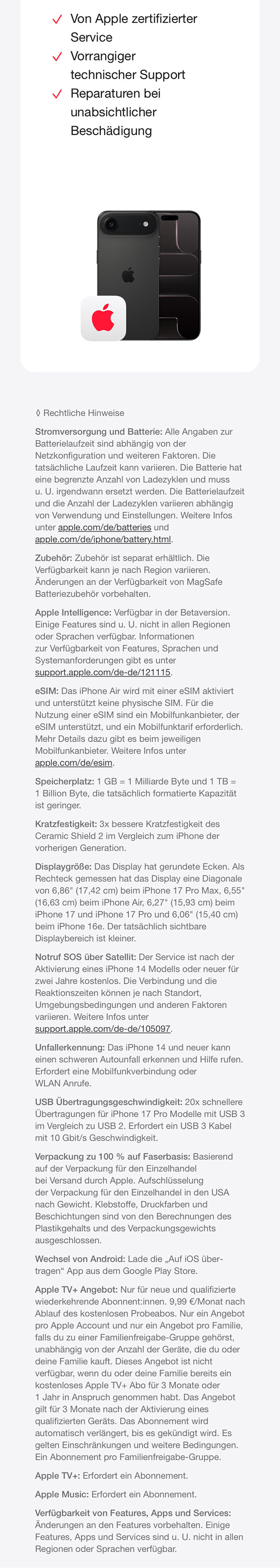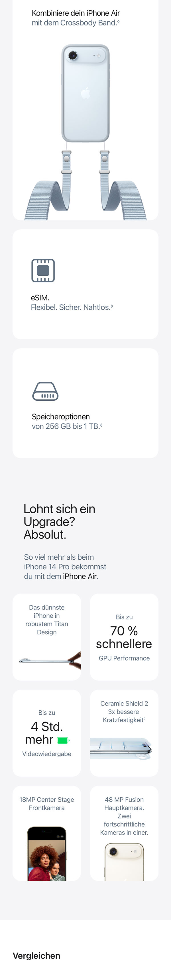 - ROBUSTER ALS JEDES iPHONE ZUVOR − Ultraleichter Rahmen aus Titan. Der Ceramic Shield schützt die Rückseite des iPhone Air, für 4x höheren Bruchschutz. Und der neue Ceramic Shield 2 auf der Vorderseite hat eine 3x bessere Kratzfestigkeit.
