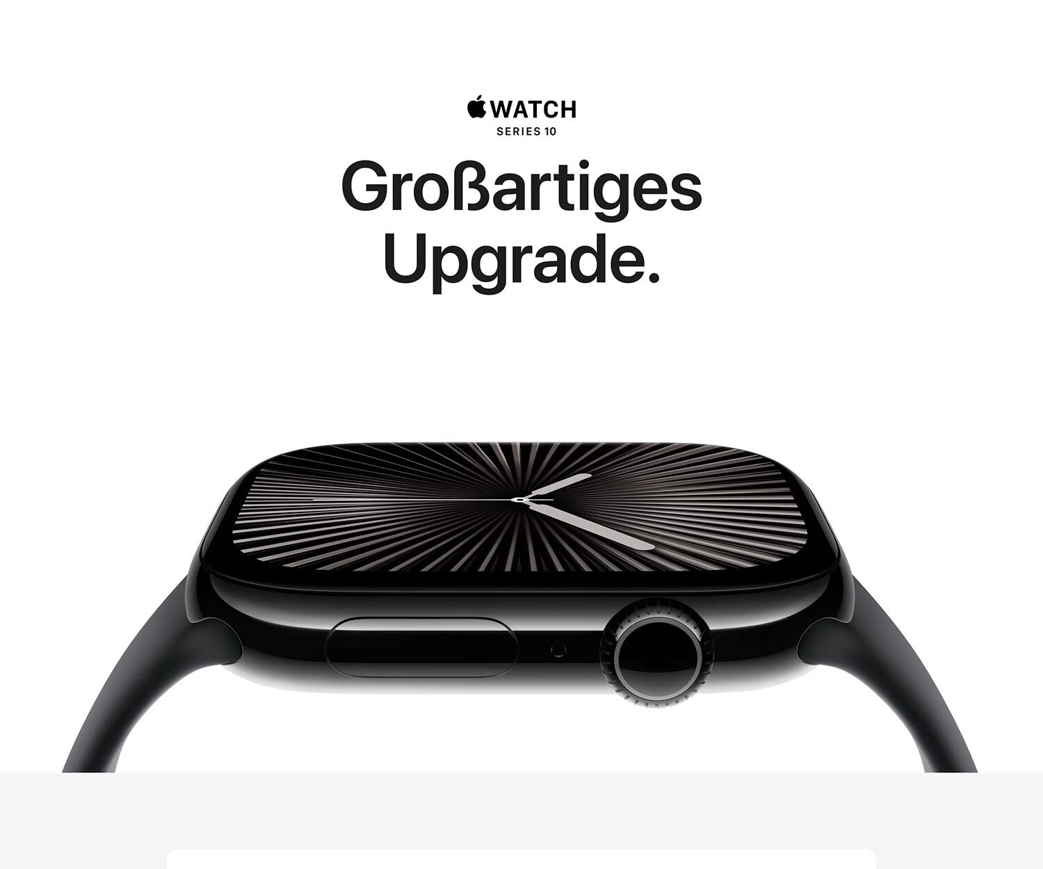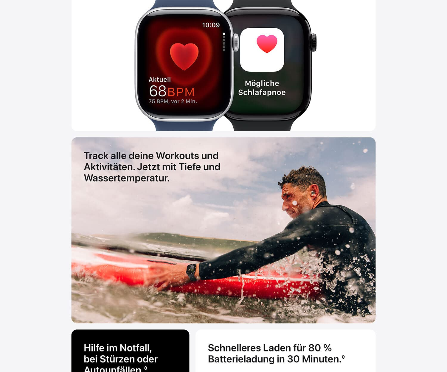 - WARUM APPLE WATCH SERIES 10 – Größeres Display mit bis zu 30 Prozent mehr Display¬bereich.* Ein dünneres und leichteres Design, noch bequemer zu tragen.* Fortschrittliche Features für Gesundheit und Fitness für wertvolle Infos.* Sicherheitsfeatures rufen Hilfe, wenn du sie brauchst.* Schnelleres Laden für 80 Prozent Batterieladung in etwa 30 Minuten.*