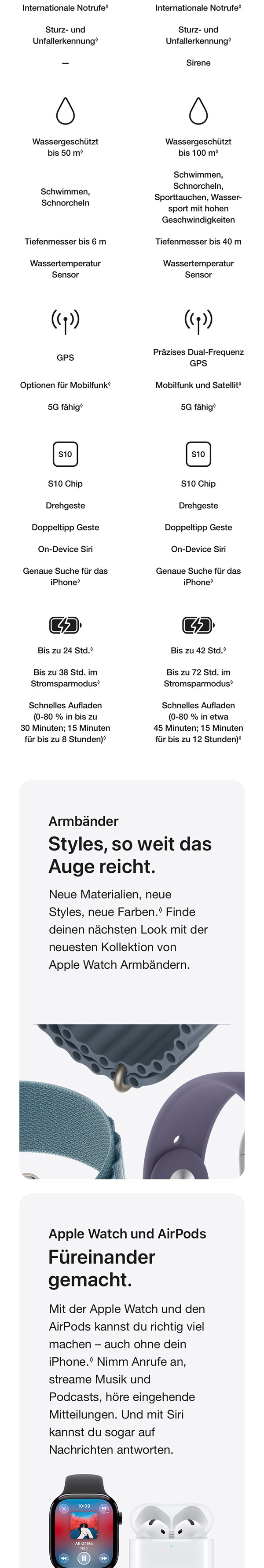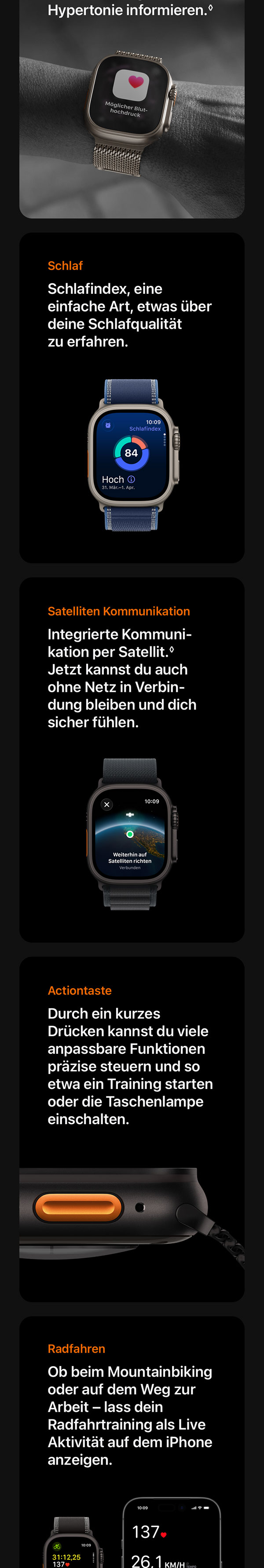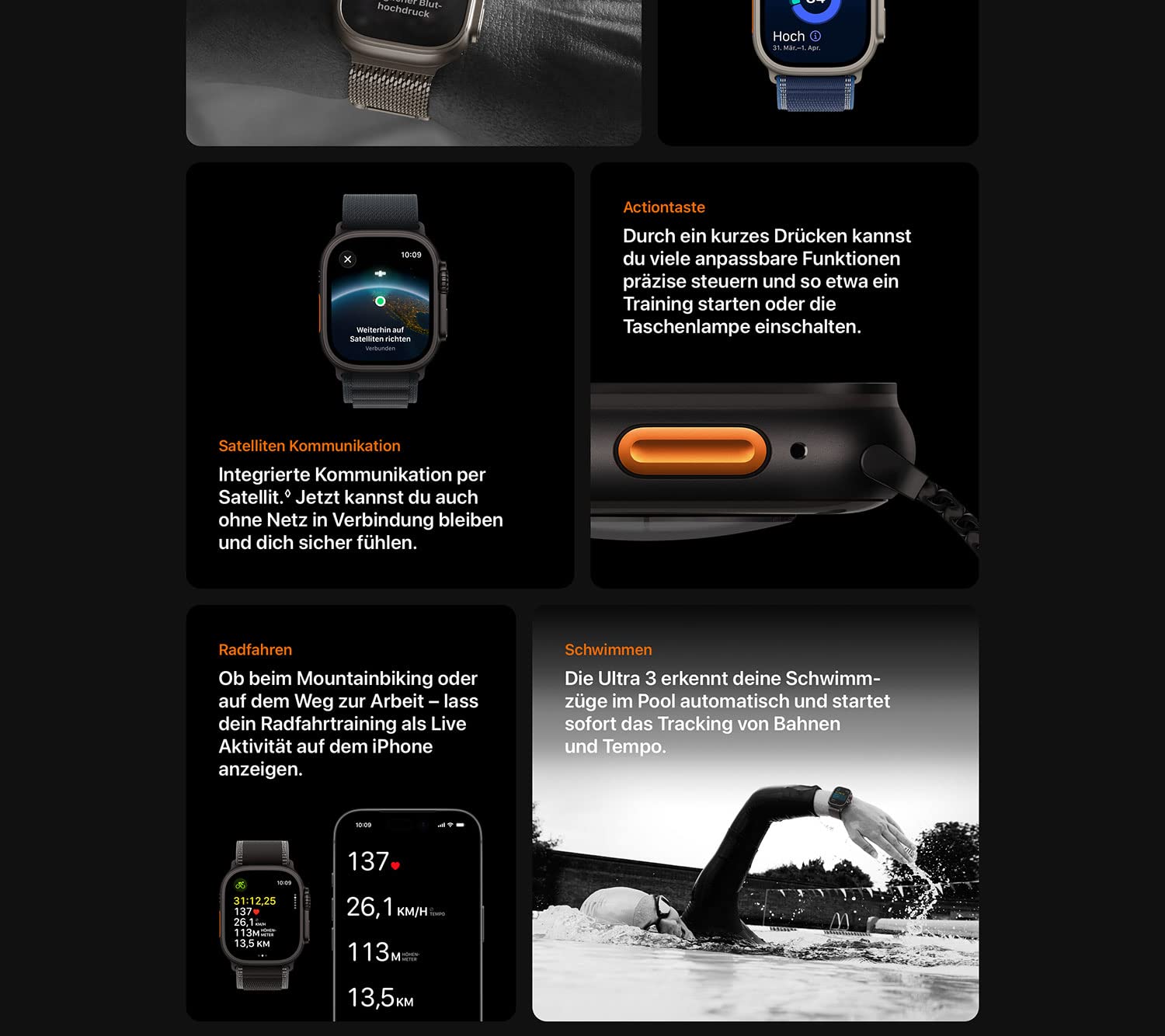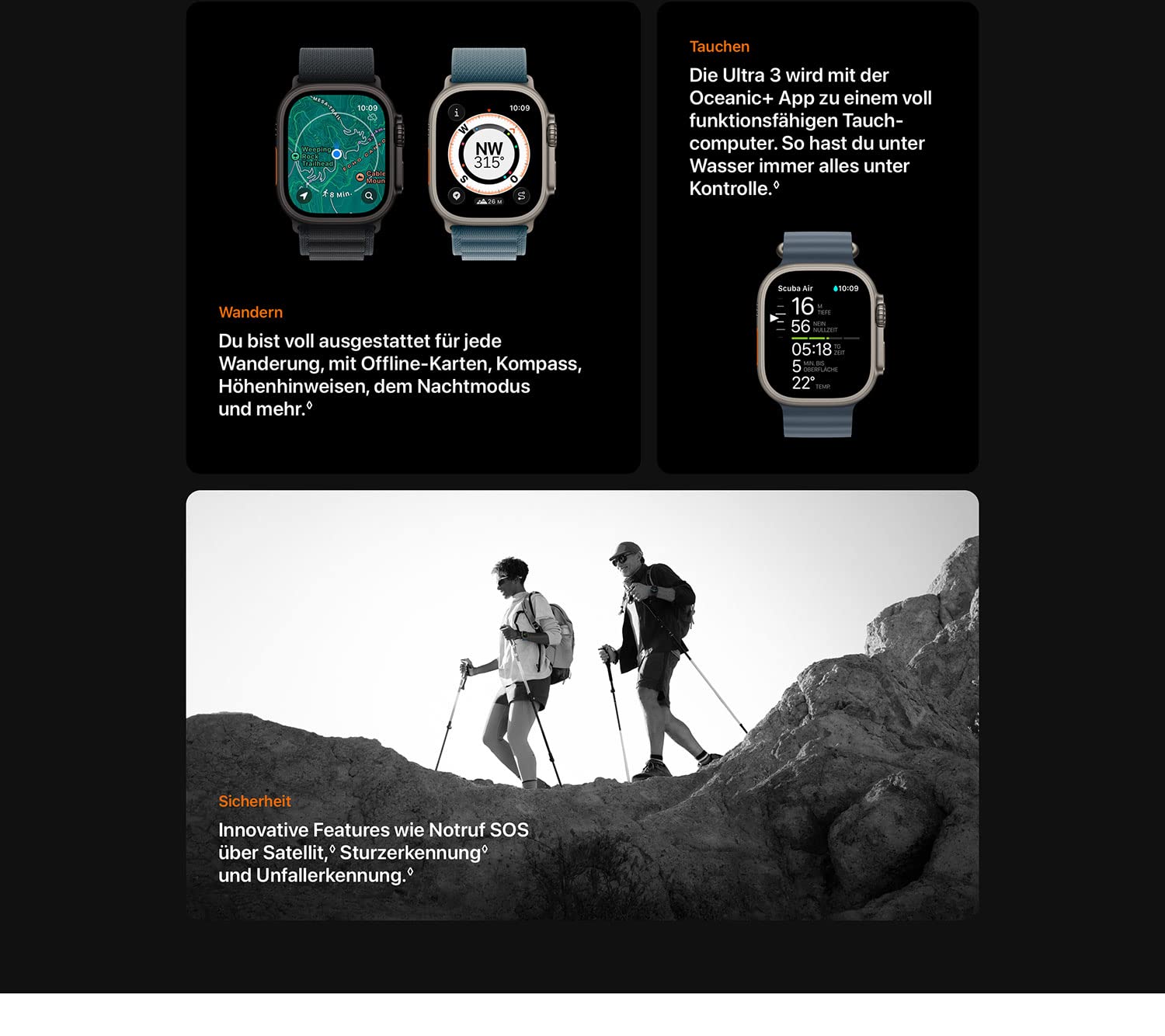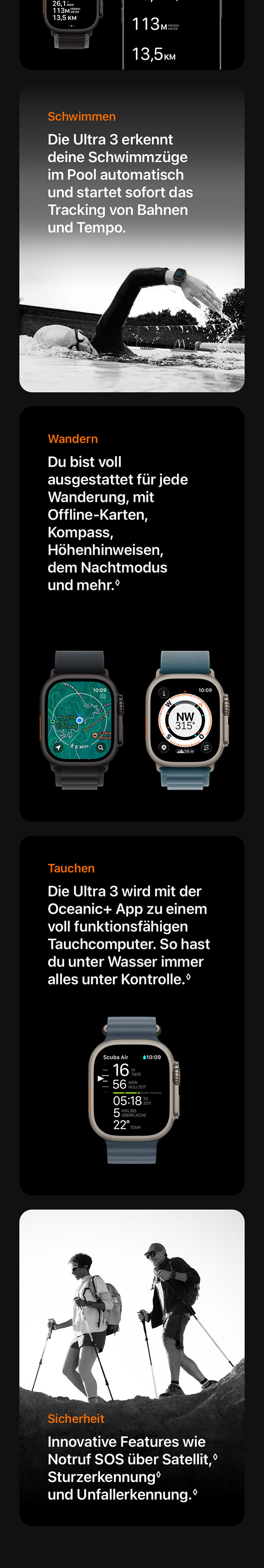 - SCHERHEITSFEATURES – Die Ultra 3 kann erkennen, ob du schwer gestürzt bist oder einen Autounfall hattest. Wenn du Hilfe brachst, aber kein Netz oder WLAN hast, kannst du mit der integrierten Satelliten Kommunikation Textnachrichten über einen Satelliten an den Notdienst senden.
