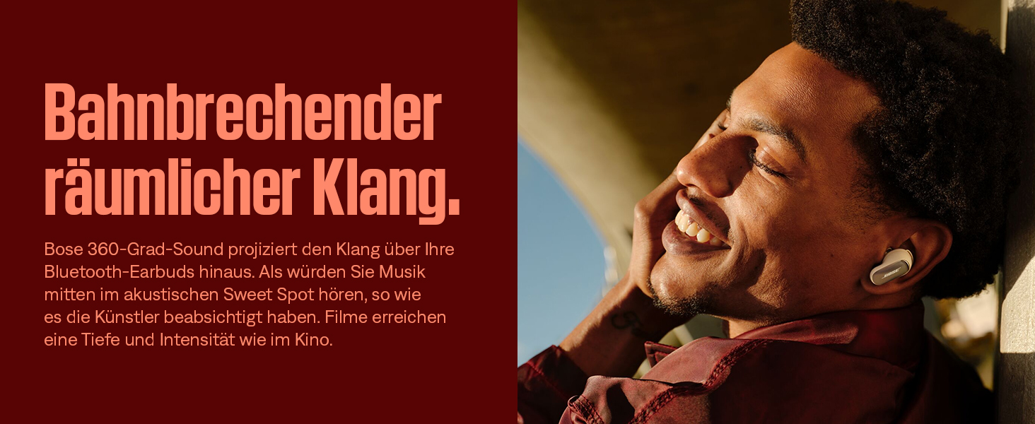 - 360-GRAD-SOUND: Bose 360-Grad-Sound projiziert den Klang aus dem Kopf nach außen – über Ihre Bluetooth-Earbuds hinaus. Das Ergebnis: ein Hörerlebnis wie im akustischen Sweet Spot, so wie es die Künstler vorgesehen haben.