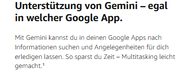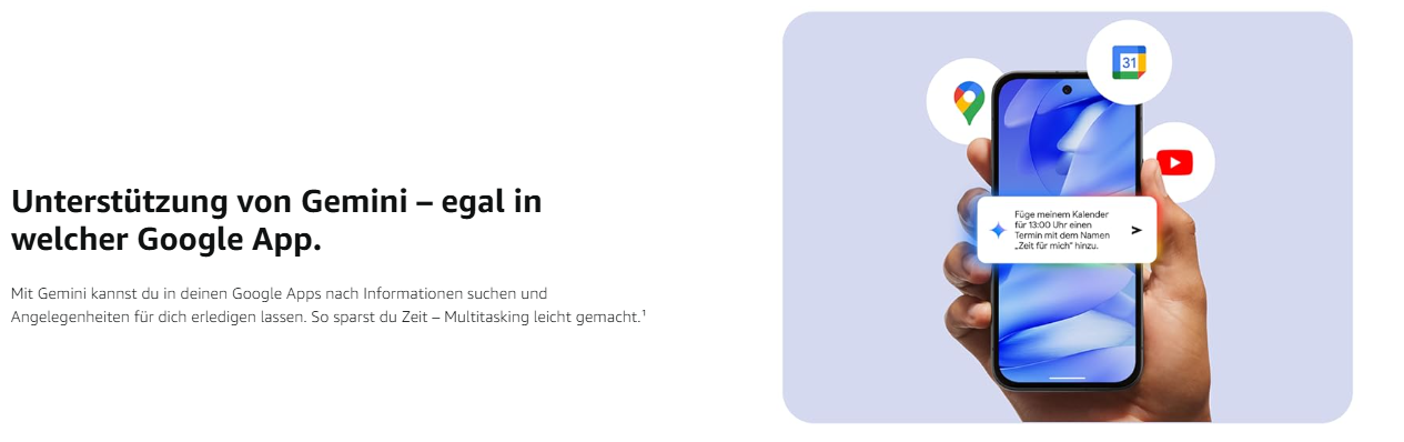 - Unterstützung von Gemini – egal in welcher Google App. Mit Gemini kannst du in deinen Google Apps nach Informationen suchen und Angelegenheiten für dich erledigen lassen. So sparst du Zeit – Multitasking leicht gemacht.