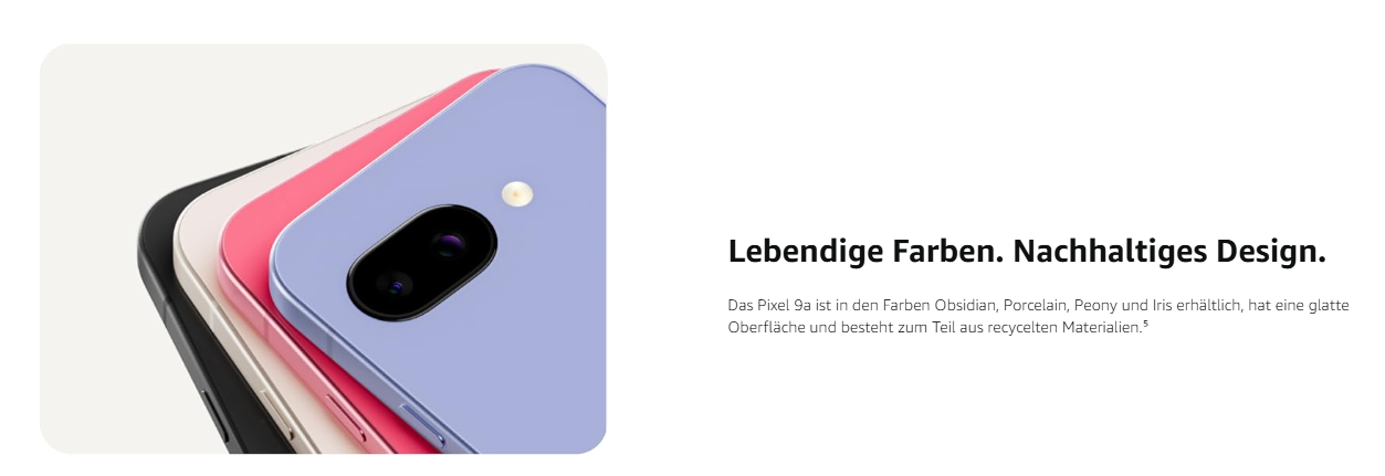 - Lebendige Farben. Nachhaltiges Design. Das Pixel 9a ist in den Farben Obsidian, Porcelain, Peony und Iris erhältlich, hat eine glatte Oberfläche und besteht zum Teil aus recycelten Materialien.