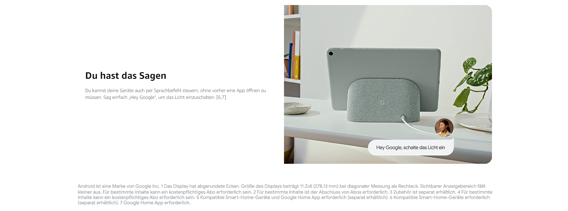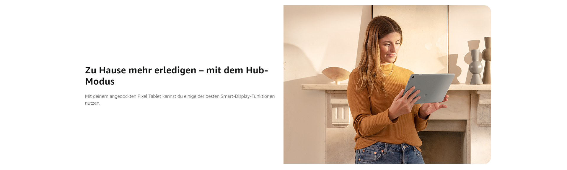 • Wenn dein Pixel Tablet gesperrt und angedockt ist, kannst du einige der besten Smart-Display-Funktionen nutzen – zum Beispiel den digitalen Bilderrahmen, die Smart-Home-Steuerung und Hilfe von Google Assistant per Sprachbefehl