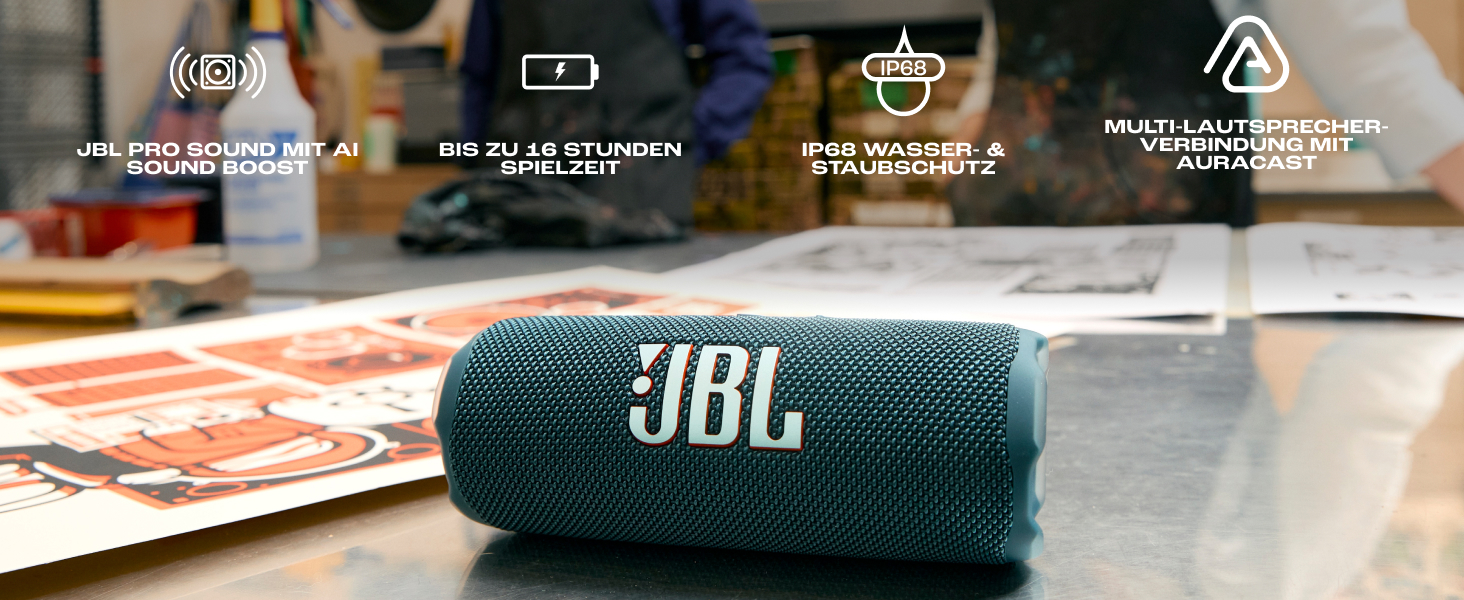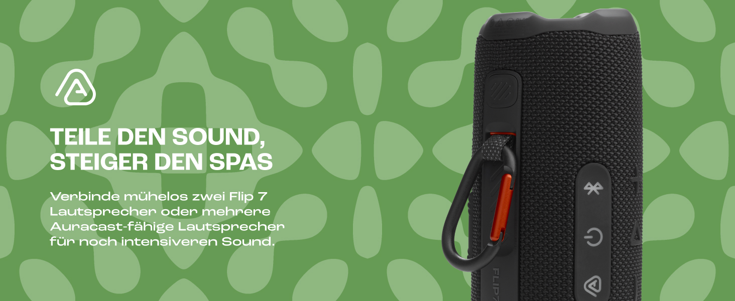 - Überall dabei: Ob Strandparty oder gemütlicher Abend - der JBL Flip 7 bietet beeindruckende Klangvielfalt und verbindet sich mit mehreren Auracast-fähigen Lautsprechern
