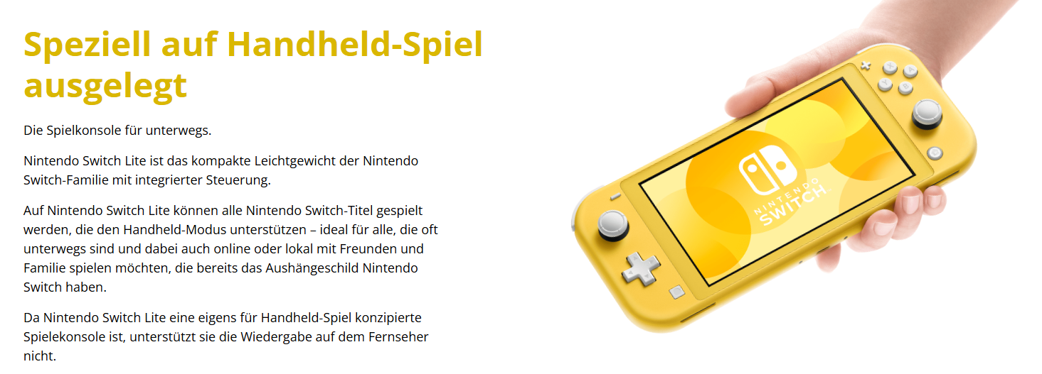 - Da Nintendo Switch Lite eine eigens für Handheld-Spiel konzipierte Spielekonsole ist, unterstützt sie Wiedergabe auf dem Fernseher nicht