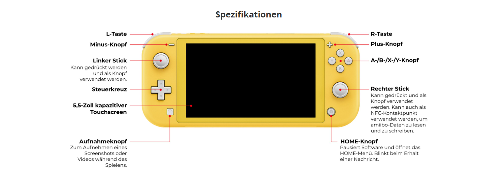 - Falls ein Spiel Joy-Con-Funktionen wie die HD-Vibration, die IR-Bewegungskamera oder die Joy-Con-Bewegungssteuerung verwendet, stehen einige Spielfunktionen beim Spielen auf Nintendo Switch Lite allein nicht zur Verfügung, Hierfür benötigst du Joy-Con-Controller (separat erhältlich)