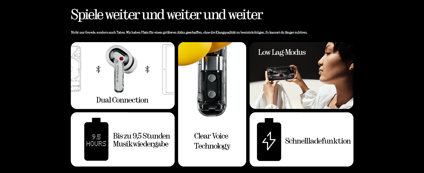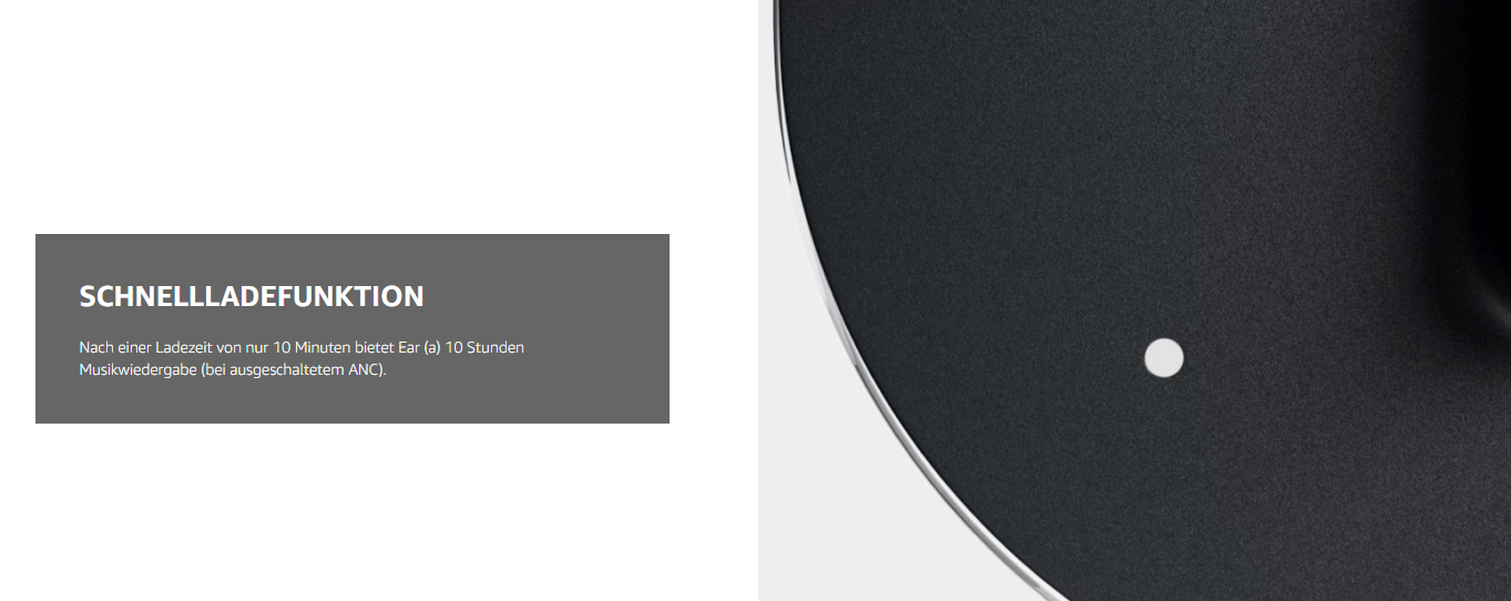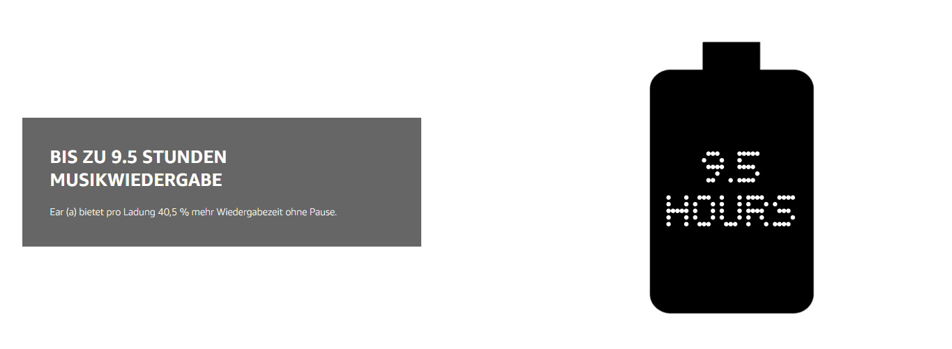 - BIS ZU 9.5 STUNDEN MUSIKWIEDERGABE: Ear (a) bietet pro Ladung 40,5 % mehr Wiedergabezeit ohne Pause. - SCHNELLLADEFUNKTION: Nach einer Ladezeit von nur 10 Minuten bietet Ear (a) 10 Stunden Musikwiedergabe (bei ausgeschaltetem ANC).