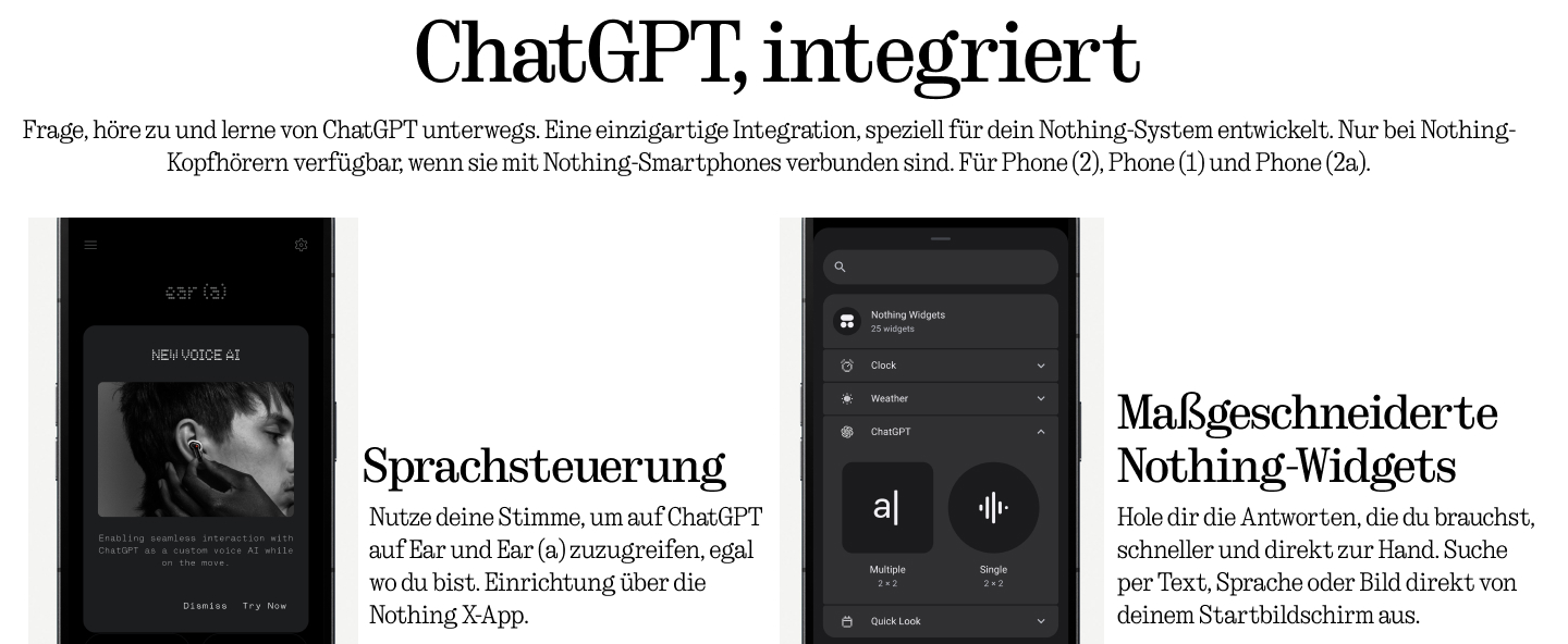 - ChatGPT, INTEGRIERT: Frage, höre zu und lerne von ChatGPT unterwegs. Eine einzigartige Integration, speziell für dein Nothing-System entwickelt. Nur bei Nothing-Kopfhörern verfügbar, wenn sie mit Nothing-Smartphones verbunden sind. Für Phone (2) und bald auch über Software-Updates für Phone (1) und Phone (2a) erhältlich. - SPRACHSTEUERUNG: Nutze deine Stimme, um auf ChatGPT auf Ear und Ear (a) zuzugreifen, egal wo du bist. Einrichtung über die Nothing X-App.