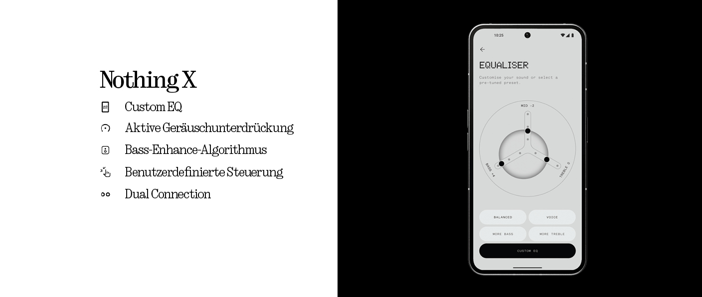 - ADAPTIVE ANC: Abschalten auf höchstem Niveau. Du kannst zwischen 3 Stufen der Geräuschunterdrückung wählen. Oder die Auswahl einfach Ear (a) überlassen. Wenn du in der Nothing X-App die Option „Adaptiv“ aktivierst, wählt Ear (a) automatisch und in Echtzeit den richtigen Grad der Geräuschunterdrückung für deine Umgebung aus, ohne dass du etwas tun musst.
