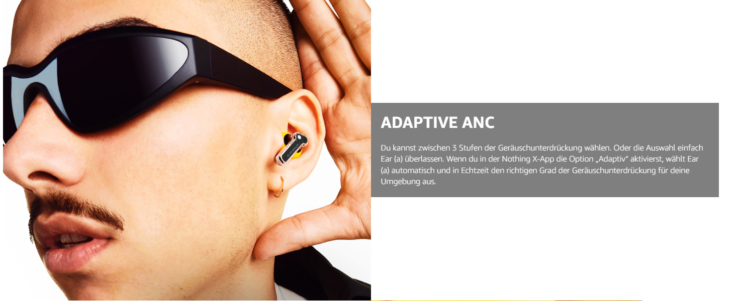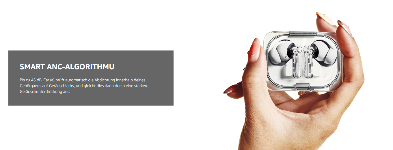 - SMART ANC-ALGORITHMUS: Bis zu 45 dB. Unsere bisher stärkste Geräuschunterdrückung. Ear (a) prüft automatisch die Abdichtung innerhalb deines Gehörgangs auf Geräuschlecks, und gleicht dies dann durch eine stärkere Geräuschunterdrückung aus. So wird die bestmögliche Geräuschunterdrückung gewährleistet. Und das bei jeder Verwendung.
