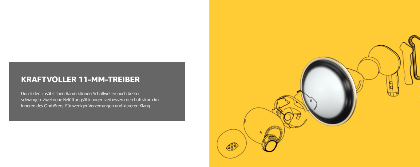 - KRAFTVOLLER 11-MM-TREIBER: Klar, satt, druckvoll. Mit doppelt so viel Leistung wie Ear (2) bietet Ear (a) noch tiefere Bässe. Durch den zusätzlichen Raum können Schallwellen noch besser schwingen. Zwei neue Belüftungsöffnungen verbessern den Luftstrom im Inneren des Ohrhörers. Für weniger Verzerrungen und insgesamt klareren Klang.