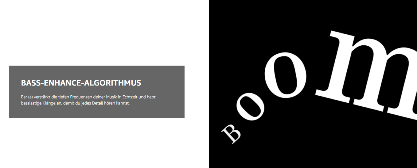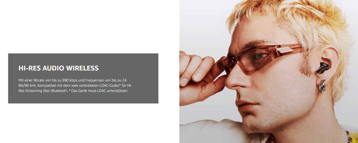 - BASS-ENHANCE-ALGORITHMUS: Ear (a) verstärkt die tiefen Frequenzen deiner Musik in Echtzeit und hebt basslastige Klänge an, damit du jedes Detail hören kannst. FÜR HI-RES AUDIO WIRELESS ZERTIFIZIERT: mit einer Bitrate von bis zu 990 kbps und Frequenzen von bis zu 24 Bit/96 kHz. Kompatibel mit dem weit verbreiteten LDAC-Codec* für Hi-Res-Streaming über Bluetooth. Das Ergebnis ist ein unglaublich klares Klangerlebnis. Genau wie vom Künstler vorgesehen. * Das Gerät muss LDAC unterstützen.