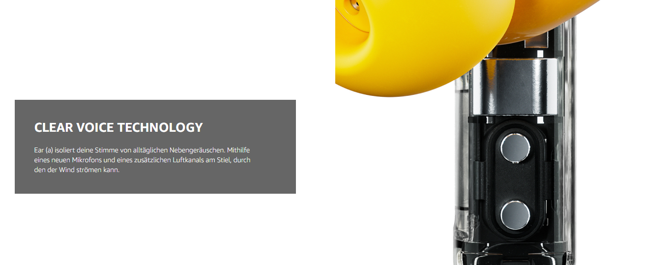 - CLEAR VOICE TECHNOLOGY: Kristallklar. Ear (a) isoliert deine Stimme von alltäglichen Nebengeräuschen, damit sich Anrufe von unterwegs wie ein persönliches Gespräch anfühlen. Mithilfe eines neuen Mikrofons und eines zusätzlichen Luftkanals am Stiel, durch den der Wind strömen kann, haben wir Störungen im Vergleich zu Ear (2) um 60 % reduziert.
