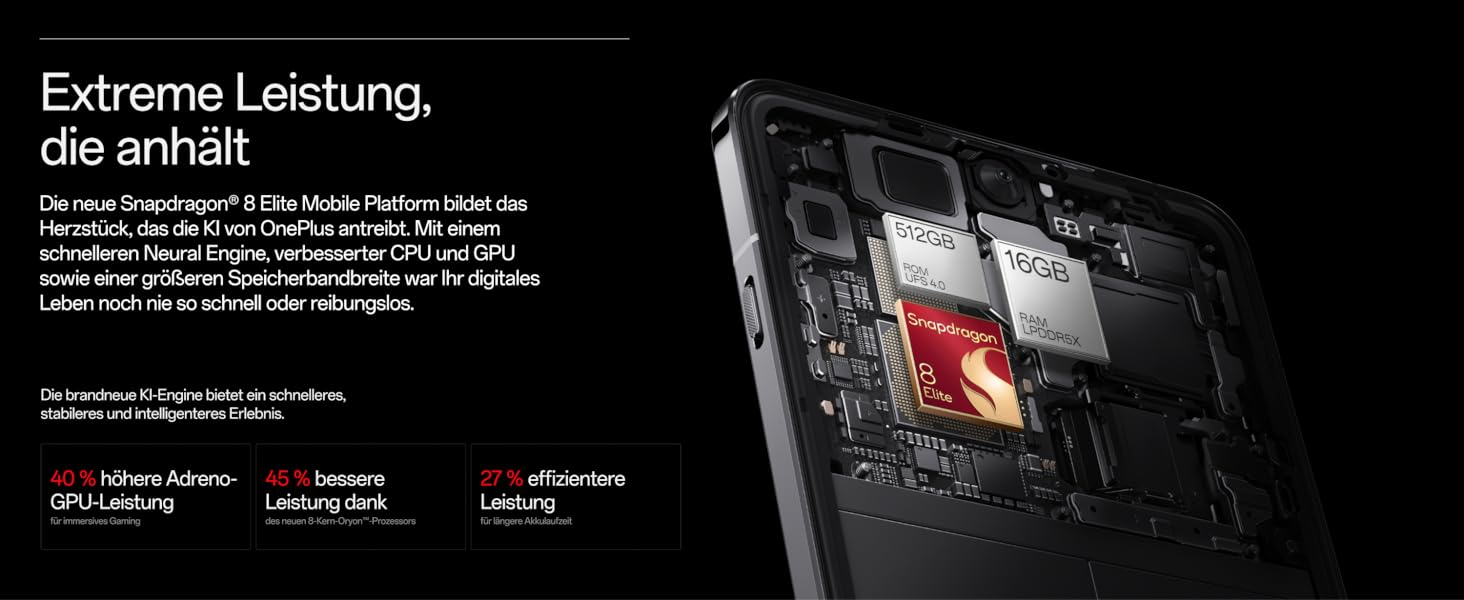 - {Chipset} – Die neue Snapdragon 8 Elite Mobile Plattform ist das Herzstück, das die KI von OnePlus antreibt. Mit einer schnelleren Neural Engine, verbessertem CPU und GPU sowie einem deutlichen Anstieg der Speicherbandbreite war Gaming, Entertainment und digitales Leben noch nie so schnell und flüssig.