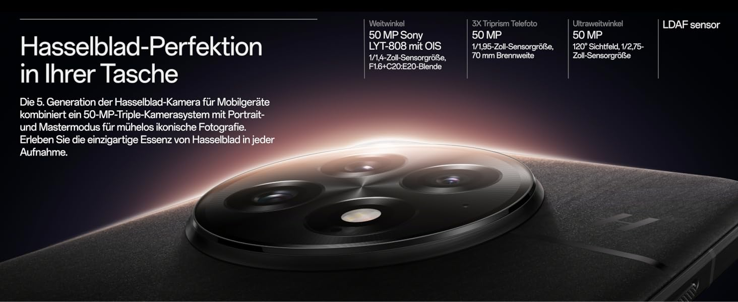 - {Kamera} – 50MP LYT-808 Hauptkamera (1/1,4" Sensorgröße, F1.6 Blende) + OIS, 3X Triprism Tele 50MP (1/1,95" Sensorgröße, 70mm Brennweite), Ultraweitwinkel 50MP (120° Sichtfeld, 1/2,75" Sensorgröße) – Die 5. Generation der Hasselblad-Kamera für Mobilgeräte kombiniert ein leistungsstarkes 50MP-Triple-Kamera-System, den Porträtmodus und den Master-Modus für mühelos ikonische Fotografie. Erfasse mit jedem Bild die einzigartige Essenz von Hasselblad.