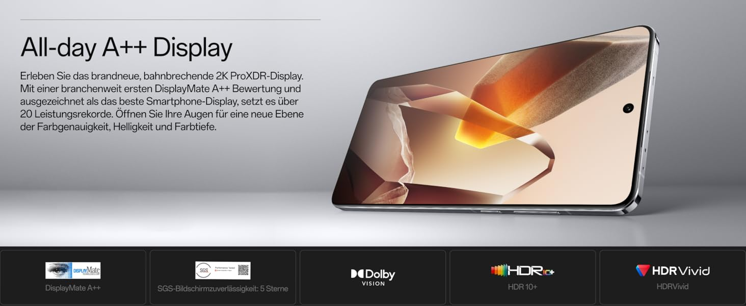 - {Display} – 6,82" 120Hz QHD-Display, 510 PPI. Erlebe das brandneue, bahnbrechende 2K ProXDR-Display. Mit der weltweit ersten DisplayMate A++ Bewertung und ausgezeichnet als Bestes Smartphone-Display, setzt es über 20 neue Leistungsrekorde. Entdecke eine neue Stufe der Farbgenauigkeit, Helligkeit und Farbtiefe. Ob Regen, Dusche oder ölige Finger – die nächste Generation von Aqua Touch 2.0 sorgt für eine reibungslose Bedienung.