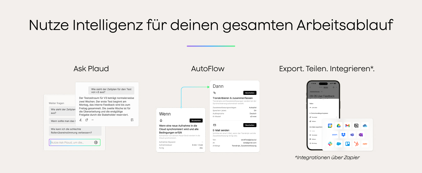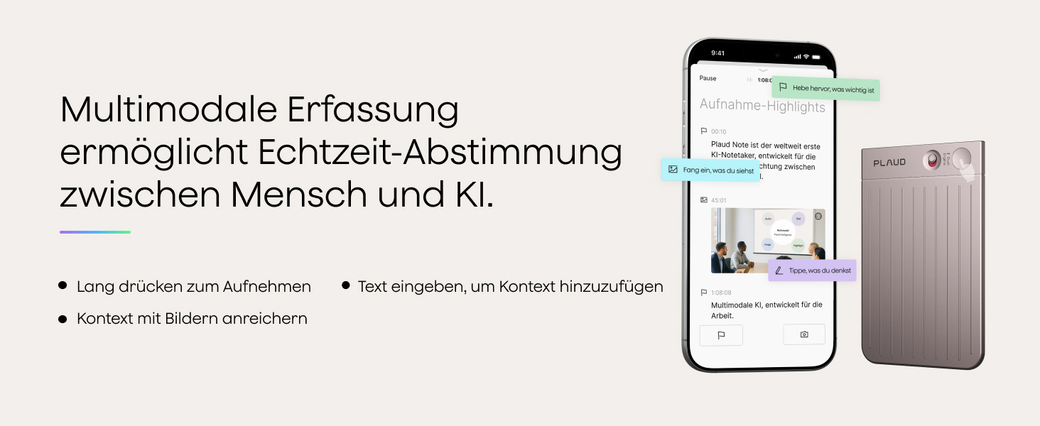 • Plaud Intelligence: Das KI Diktiergerät bietet Transkription in 112 Sprachen mit Sprecher-Labels und anpassbarem Vokabular. Generiere multidimensionale Zusammenfassungen mit über 10.000 Vorlagen, Mind-Maps und nahtloser Workflow-Integration.