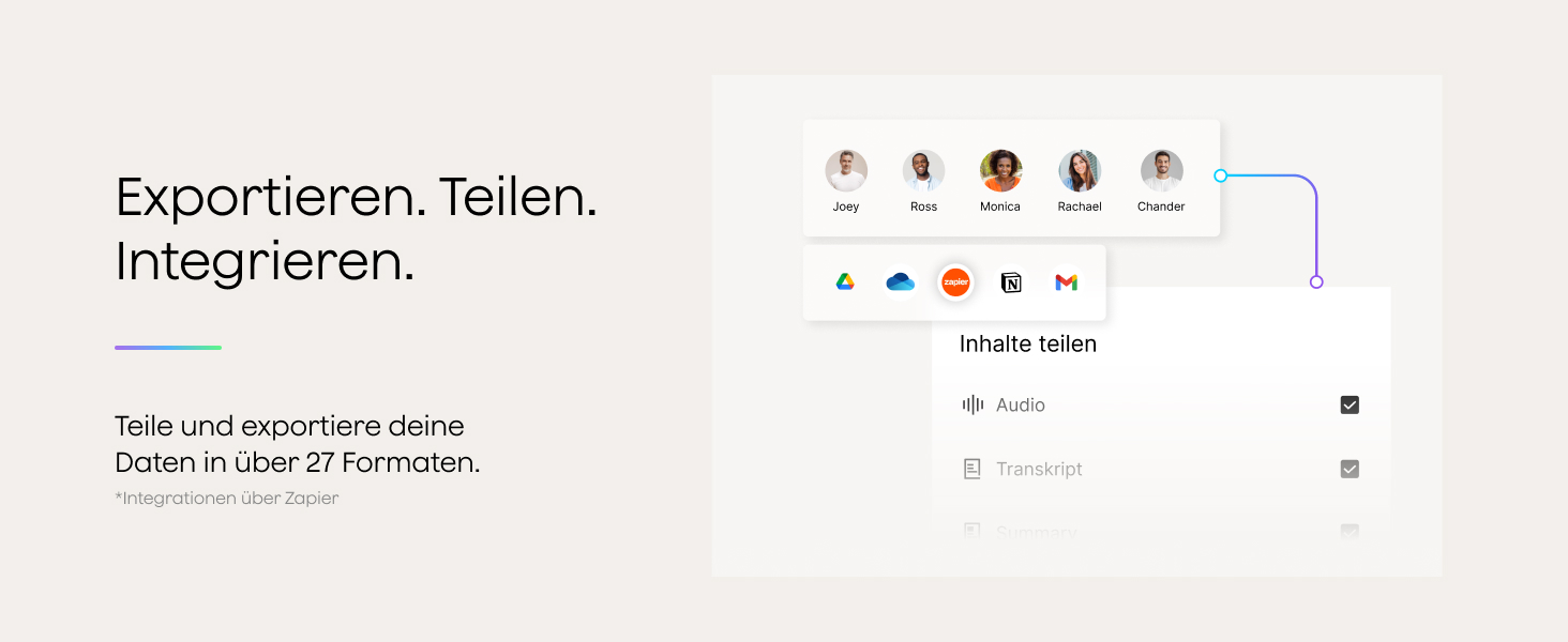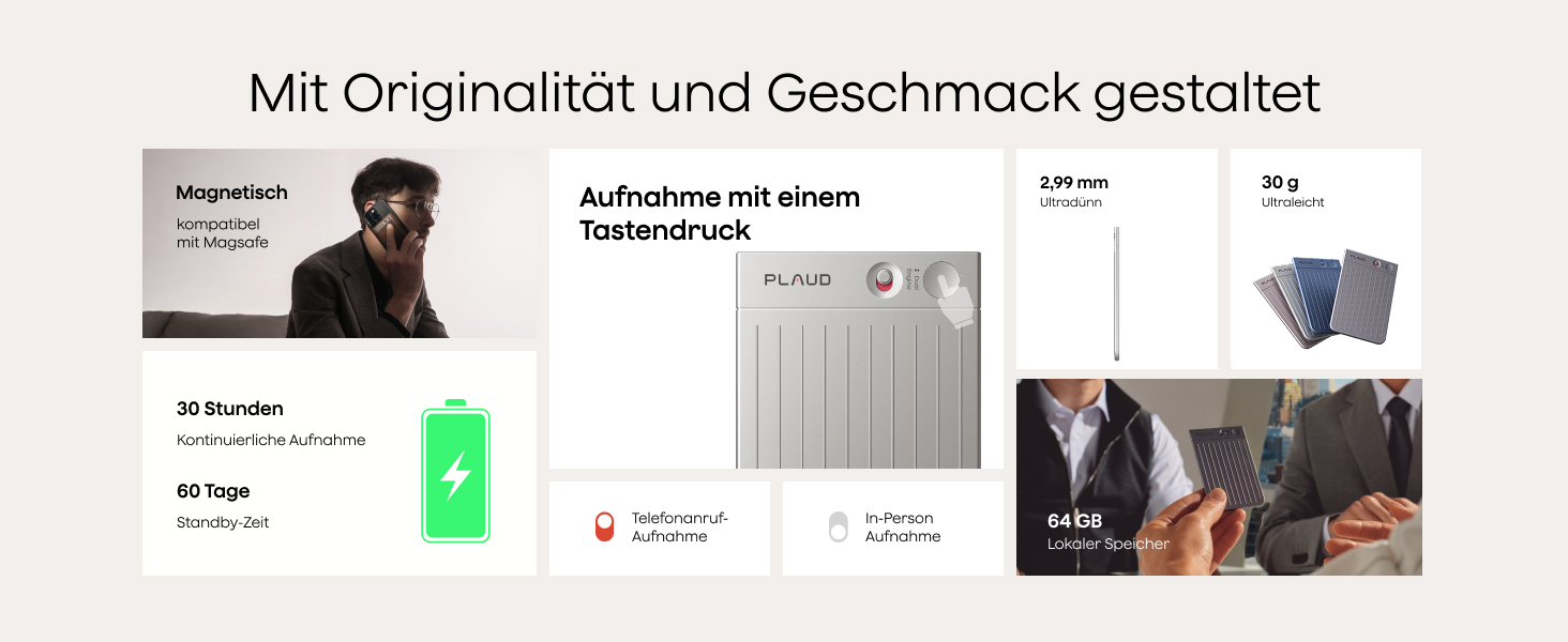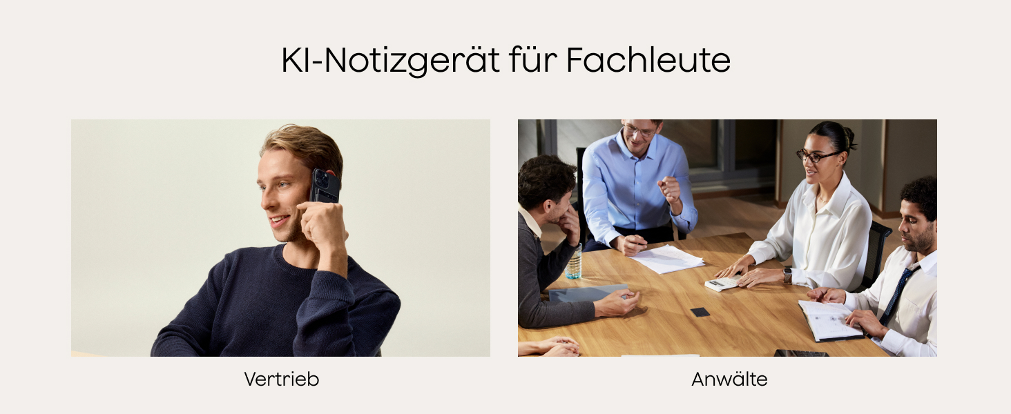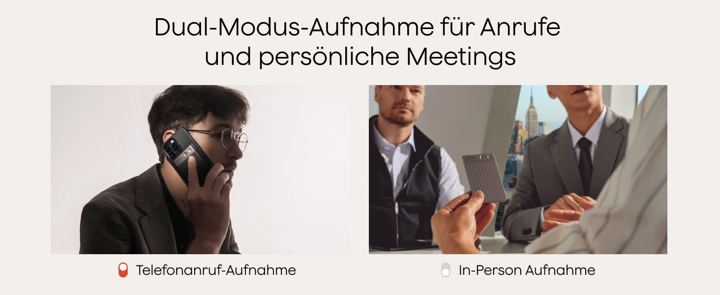 • Dual-Modus-Aufnahme: Wechsel zwischen den Aufnahmemodi für Telefonate und persönliche Gespräche, damit jedes Detail ohne Ablenkung erfasst wird.