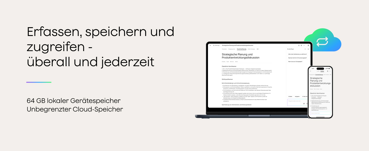 • Plaud Desktop: Greife mit jedem Plaud-Gerät auf Plaud Desktop zu, um Online- und persönliche Meetings aufzunehmen, und verwalte dann alle deine Tonaufnahmen in der Plaud App und auf Plaud Web.