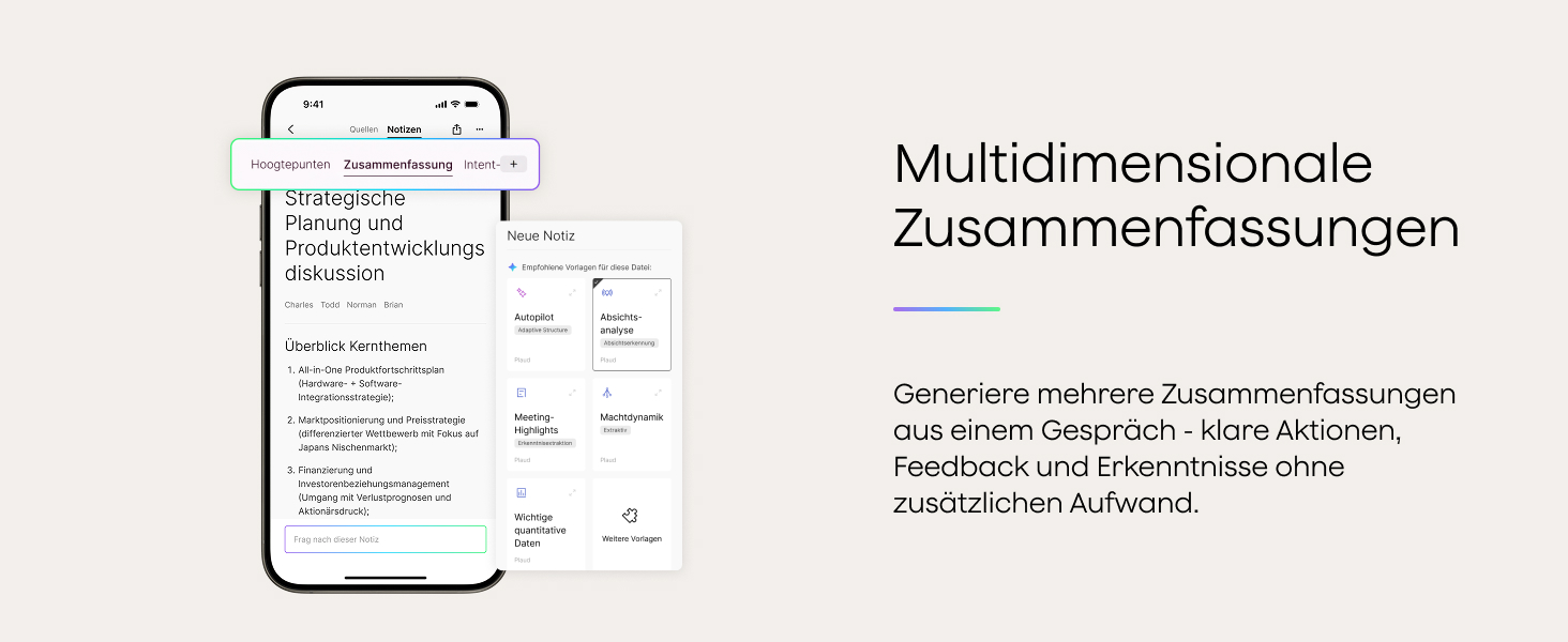• Multidimensionale Zusammenfassungen: Mit über 10.000 professionellen Vorlagen verwandelt Plaud Voice Recorder ein Gespräch in mehrere Perspektiven für schnellere, klarere Erkenntnisse.