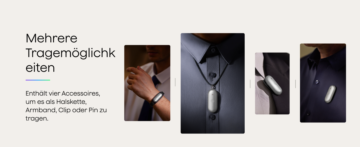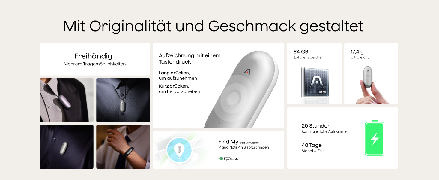 • Plaud NotePin S Diktiergerät mit Transkription und 4 Tragemodi: Trage deine KI auf deine Weise. Vielseitigkeit in ihrer besten Form – trage es als Halskette, als Armband, als Clip oder als Pin. Hinweis: Für Nutzer mit Herzschrittmachern - Bitte vermeide es, den NotePin S aufgrund des Magnetismus auf der Brust zu tragen (auch mit Trageband, magnetischem Pin oder Clip). Halskette oder Armband sind nicht im Lieferumfang enthalten.