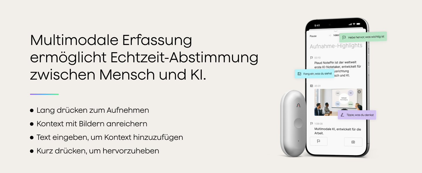 • MULTIMODALE EINGABE: Mit einer physischen taktilen Taste unterstützt Plaud NotePin S das lange Drücken zum Aufzeichnen und das kurze Drücken zum Markieren wichtiger Momente. Erfasse Gespräche mithilfe von Audioaufnahmen, Notizen, Bildern und Highlights, um einen umfassenderen Kontext zu erhalten.