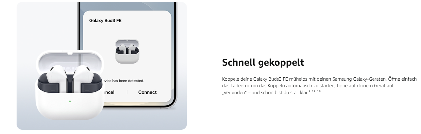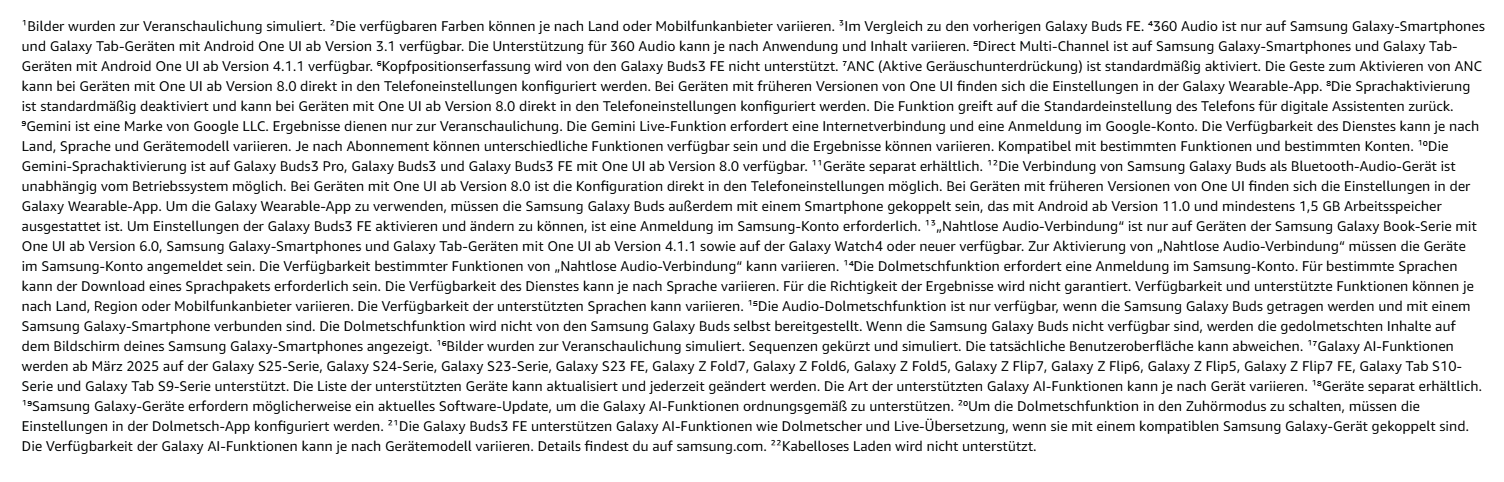 - GEMINI-ANBINDUNG: Chatte mit Gemini auf deinem verbundenen Smartphone direkt über deine Galaxy Buds3 FE, indem du einfach „Hey Google“ sagst, um in den hektischen Momenten des Alltags Unterstützung zu erhalten¹ ⁸ ⁹ ¹⁰