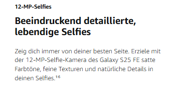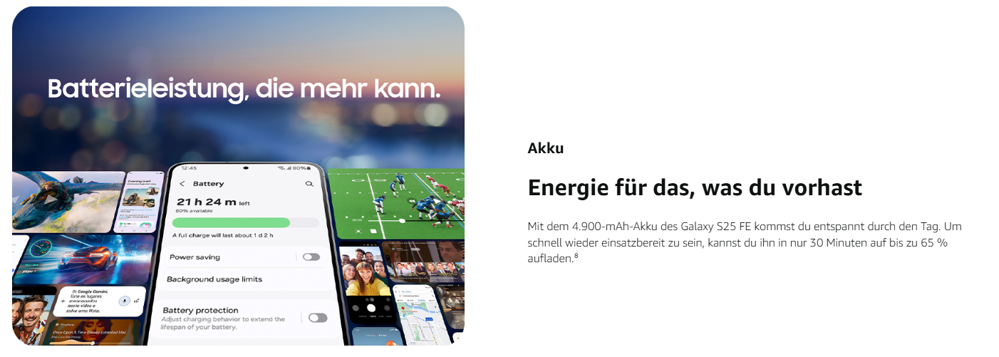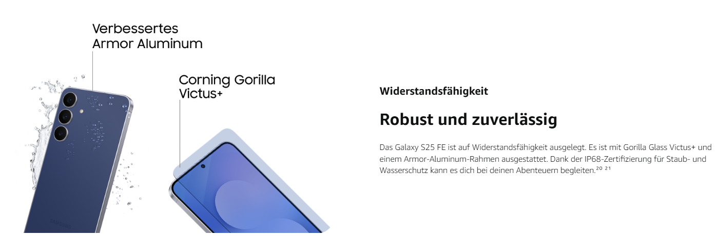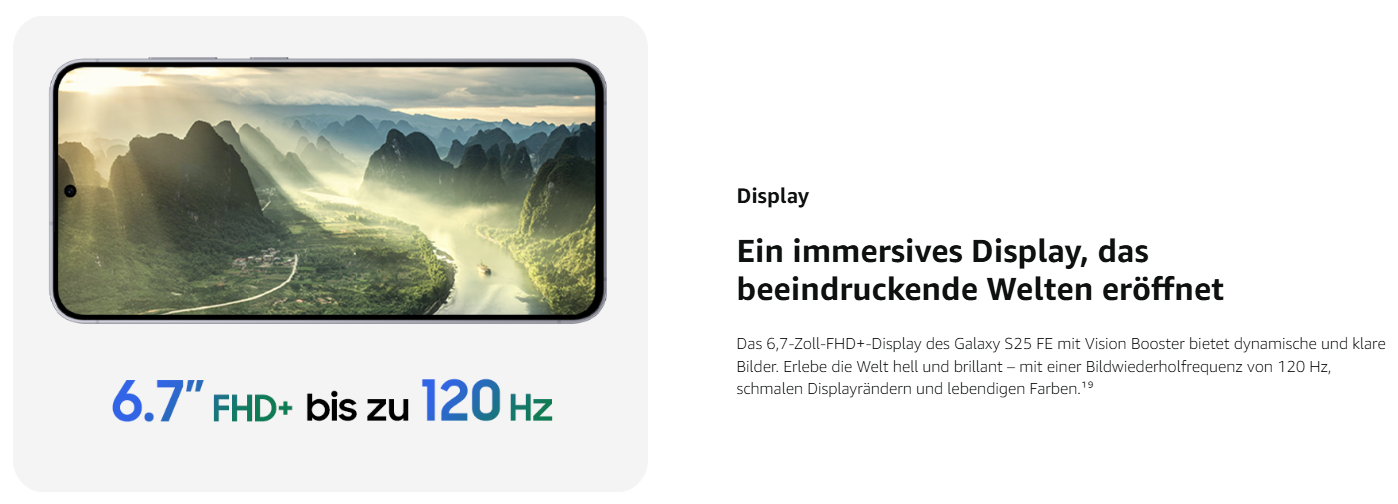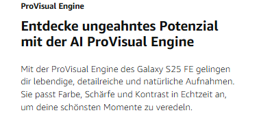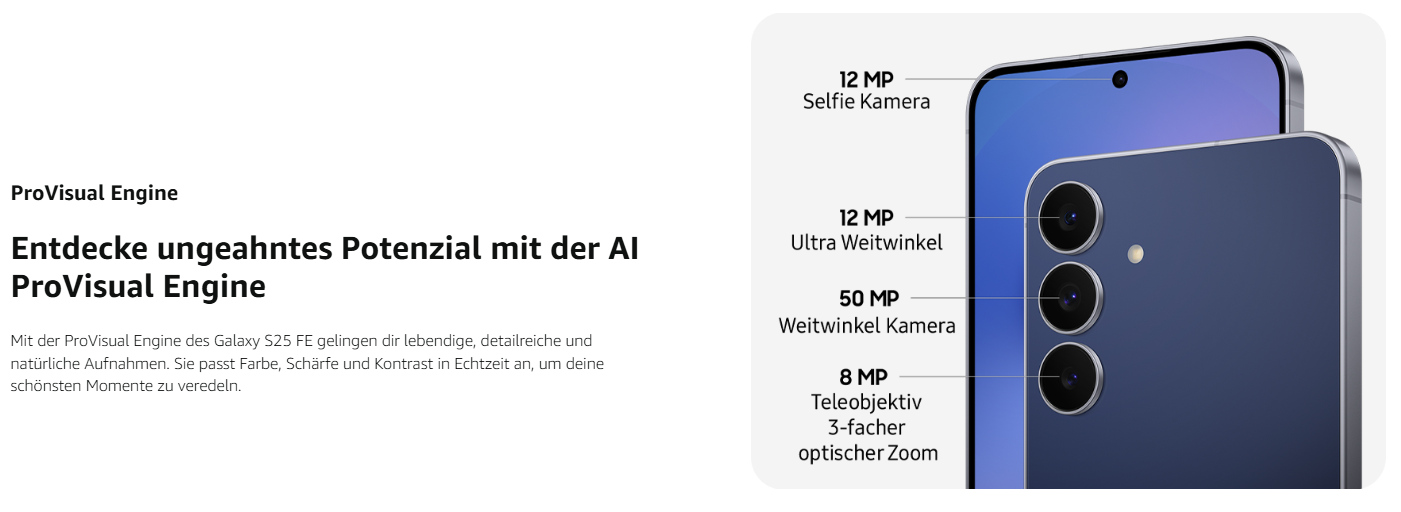 - Galaxy S25 FE AI ProVisual Engine: Passe deine Fotos an und halte deine schönsten Erinnerungen mit optimierten Farben, Schärfe und Kontrast in Echtzeit fest – denn jede Aufnahme und jedes Video ist lebendig, detailliert und natürlich⁵