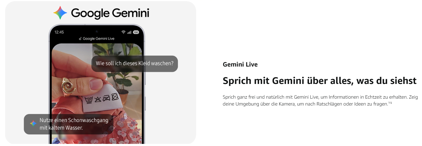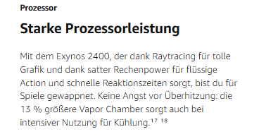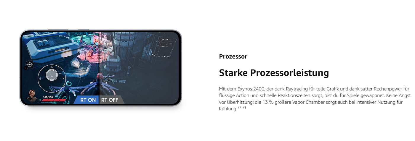 - Gaming und Leistung: Ausgestattet mit dem Exynos 2400, erlebst du flüssiges Gameplay und schnelle Reaktionszeiten; Das hardwarebasierte Raytracing und eine 13 % größere Vapor Chamber sorgen für eine atemberaubende Grafik und kühle Performance auch bei intensiver Nutzung⁶ ⁷