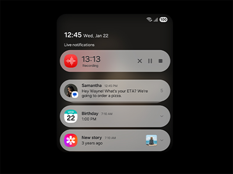 Schau dir an, was gerade los ist. Live-Benachrichtigungen ermöglichen dir, laufende Aktivitäten wie Timer und Sprachaufnahmen über die Now Bar, die Statusleiste oder auch oben im normalen Benachrichtigungsfeld zu überwachen.