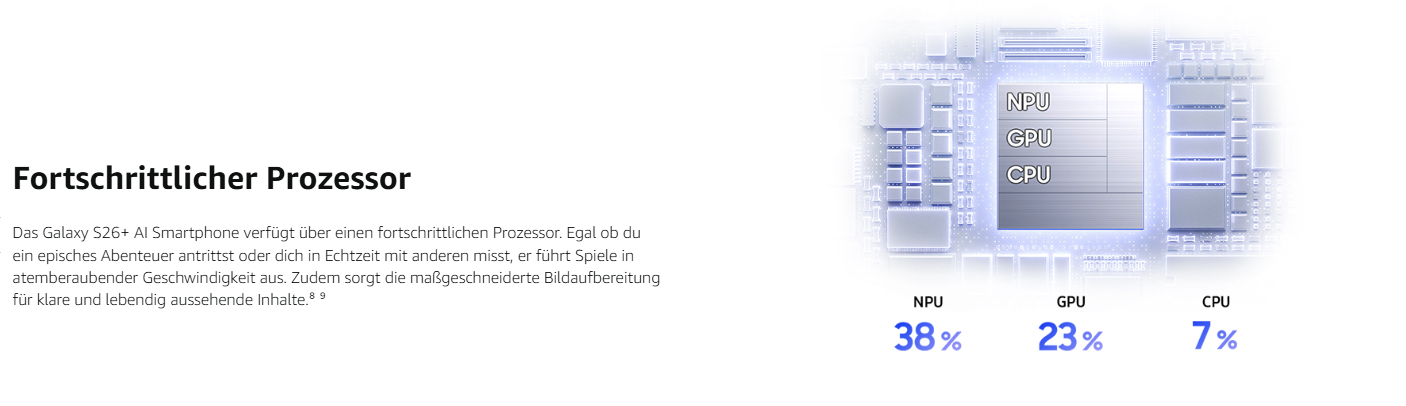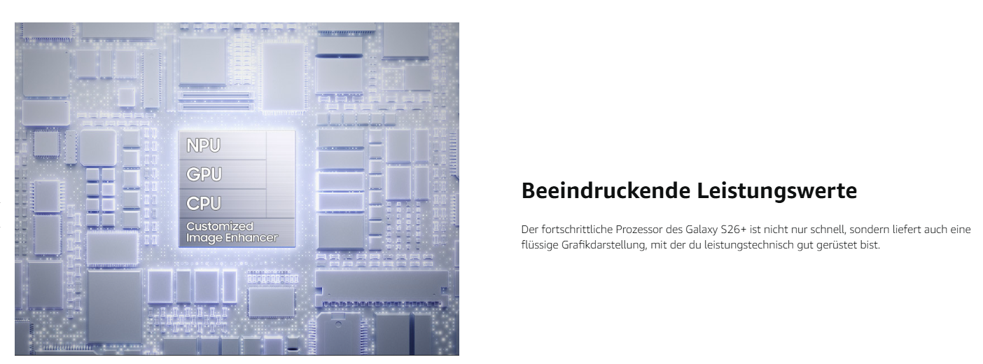 • PRODUKTIOV UND KREATIV: Dank seinem fortschrittlichen Prozessor arbeitet das Galaxy S26+ nicht nur schnell, sondern liefert auch eine flüssige Grafikdarstellung, sodass du leistungstechnisch gut gerüstet bist – egal ob beim Spielen oder Arbeiten⁴