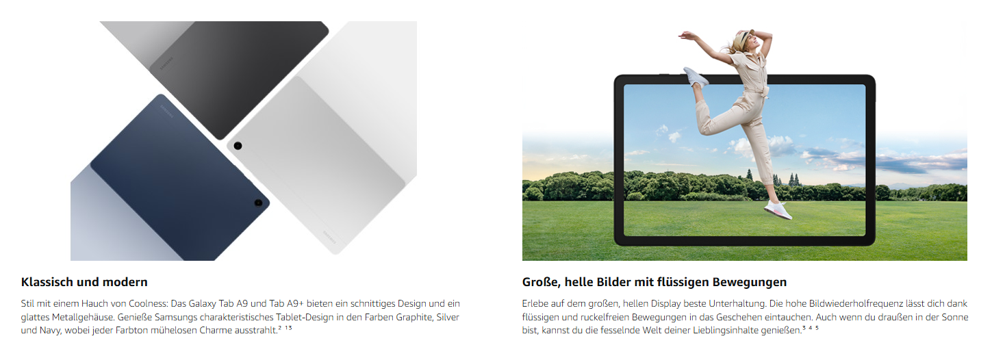 - Moderner Stil, fesselndes Display: Das Samsung Galaxy Tab A9 verfügt über ein schlankes Metallgehäuse in Graphite, Silver und Navy, ergänzt durch ein großes, helles Display für immersive Unterhaltung, auch bei hellen Bedingungen¹ ² ³ ⁴ ⁵