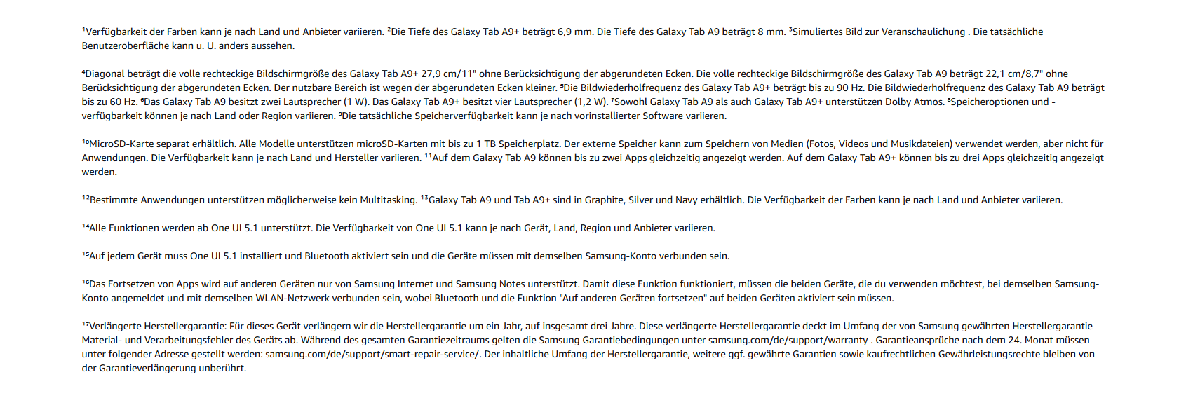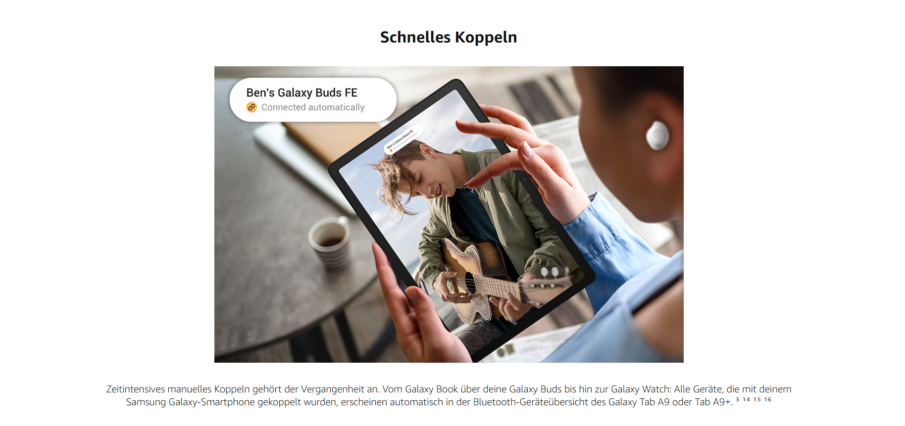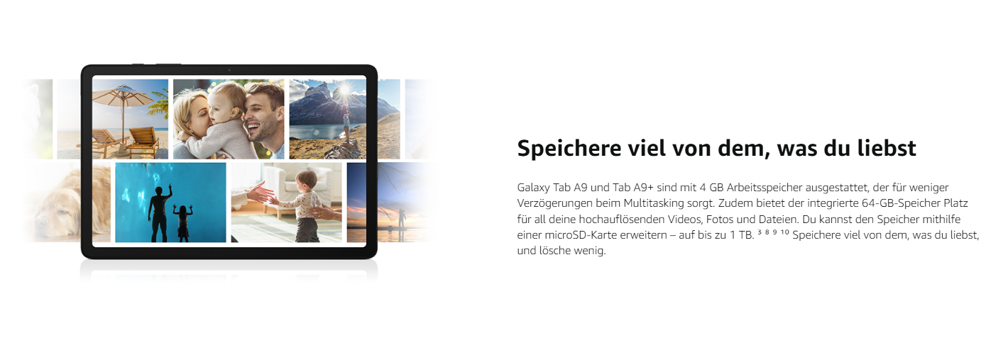 - Speichere viel von dem, was du liebst: Das Samsung Tablet Galaxy Tab A9 bietet bis zu 4 GB RAM für weniger Verzögerungen beim Multitasking, Ein integrierter 64-GB-Speicher (erweiterbar auf 1 TB) speichert all deine hochauflösenden Dateien, viel speichern und wenig löschen³ ⁸ ⁹ ¹⁰