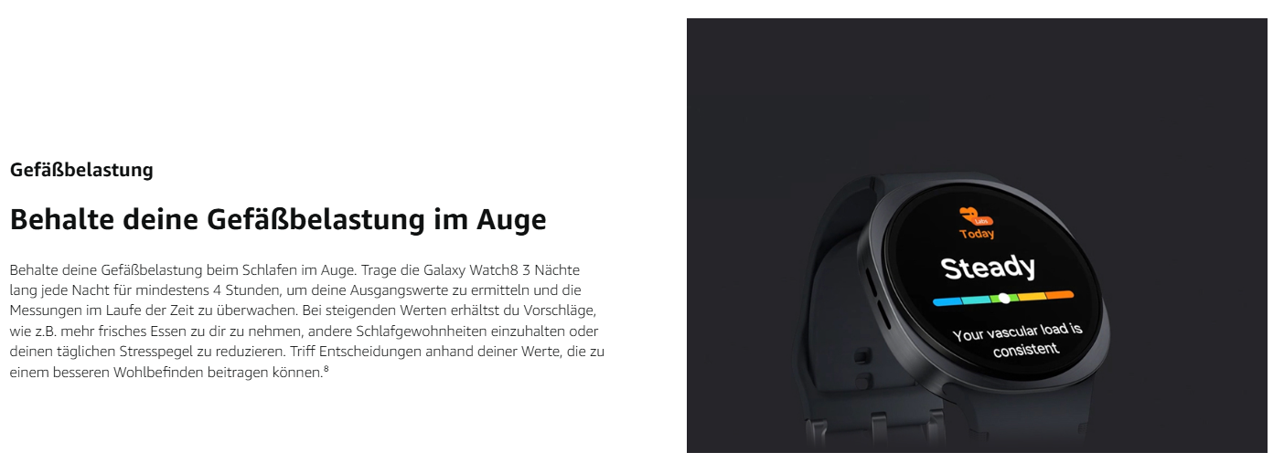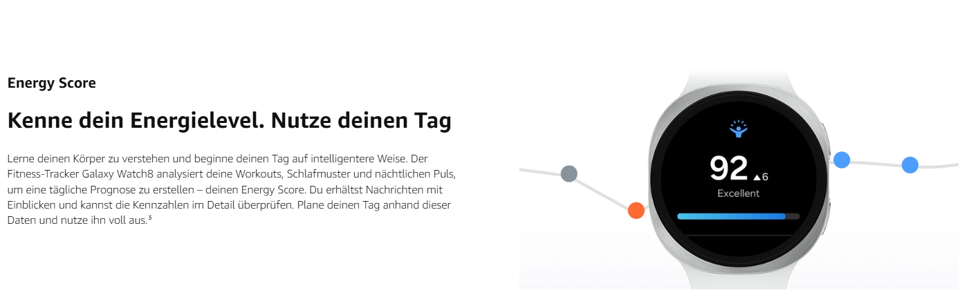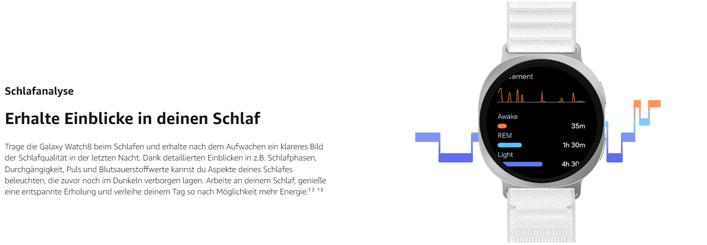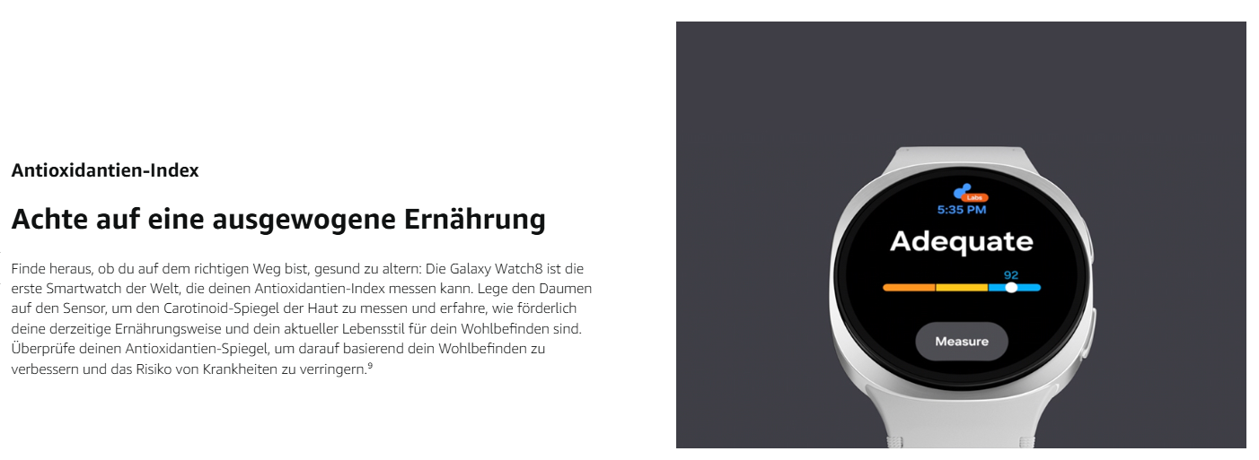 - Achte auf dein Wohlbefinden: Trage die Galaxy Watch8 jede Nacht für mindestens 4 Stunden, um die Entwicklung deines Schlafverhaltens zu tracken, Die erste Smartwatch der Welt, die deinen Antioxidantien-Index über einen Daumensensor messen kann, Überwache deinen nächtlichen AGE-Index⁸ ⁹ ¹⁰