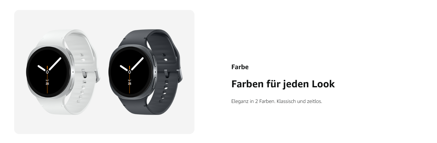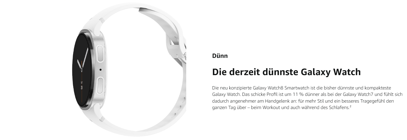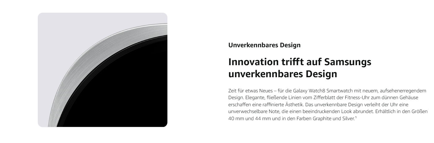 - Innovation trifft auf Design: Das neue Design der Galaxy Watch8 verleiht der Uhr eine unverwechselbare Note und eine raffinierte Ästhetik, Kompakter als je zuvor und die bisher dünnste Samsung Smartwatch für ein angenehmes Gefühl an deinem Handgelenk134