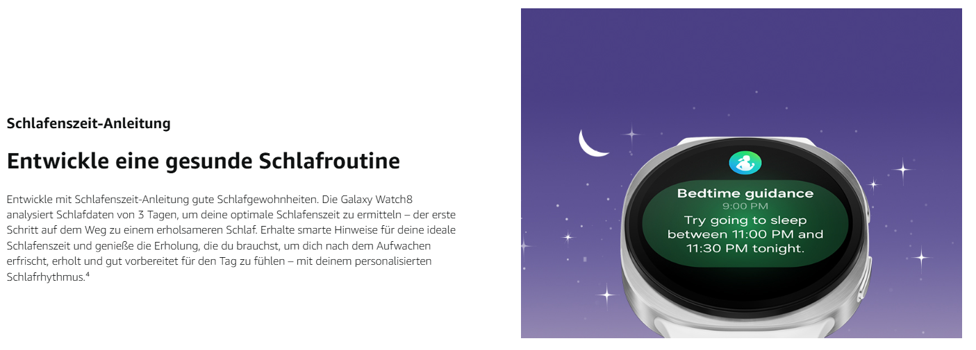 - Personalisierter Energy Score und Schlafrhythmus: Die Galaxy Watch8 analysiert Schlafmuster und den nächtliche Puls, um eine tägliche Energie-Prognose zu erstellen, Entwickle mit der Funktion Schlafenszeit-Anleitung eine gesunde Schlafenszeit-Routine, basierend auf 3 Tagen an Schlafdaten³ ⁴ ⁵